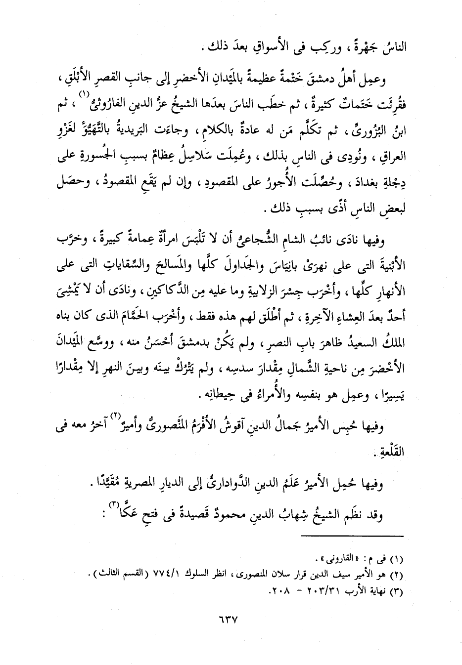 وَفِيهَا نَادَى نَائِبُ الشَّامِ الشُّجَاعِيُّ أَنْ لَا تَلْبَسَ امْرَأَةٌ عِمَامَةً كَبِيرَةً، وَخَرَّبَ الْأَبْنِيَةَ الَّتِي عَلَى نَهْرِي بَانِيَاسَ وَالْجَدَاوِلَ كُلَّهَا وَالْمَسَالِحَ وَالسِّقَايَاتِ الَّتِي عَلَى الْأَنْهَارِ كُلِّهَا، وَأَخْرَبَ جِسْرَ الزَّلَابِيَّةِ وَمَا عَلَيْهِ مِنَ الدَّكَاكِينِ، وَنَادَى أَنْ لَا يَمْشِيَ أَحَدٌ بَعْدَ الْعِشَاءِ الْآخِرَةِ، ثُمَّ أَطْلَقَ لَهُمْ هَذِهِ فَقَطْ، وَأَخْرَبَ الْحَمَّامَ الَّذِي كَانَ بَنَاهُ الْمَلِكُ السَّعِيدُ ظَاهِرَ بَابِ النَّصْرِ، وَلَمْ يَكُنْ بِدِمَشْقَ أَحْسَنُ مِنْهُ، وَوَسَّعَ الْمَيْدَانَ الْأَخْضَرَ مِنْ نَاحِيَةِ الشَّمَالِ مِقْدَارَ سُدُسِهِ، وَلَمْ يَتْرُكْ بَيْنَهُ وَبَيْنَ النَّهْرِ إِلَّا مِقْدَارًا يَسِيرًا، وَعَمِلَ هُوَ بِنَفْسِهِ وَالْأُمَرَاءُ فِي حِيطَانِهِ.