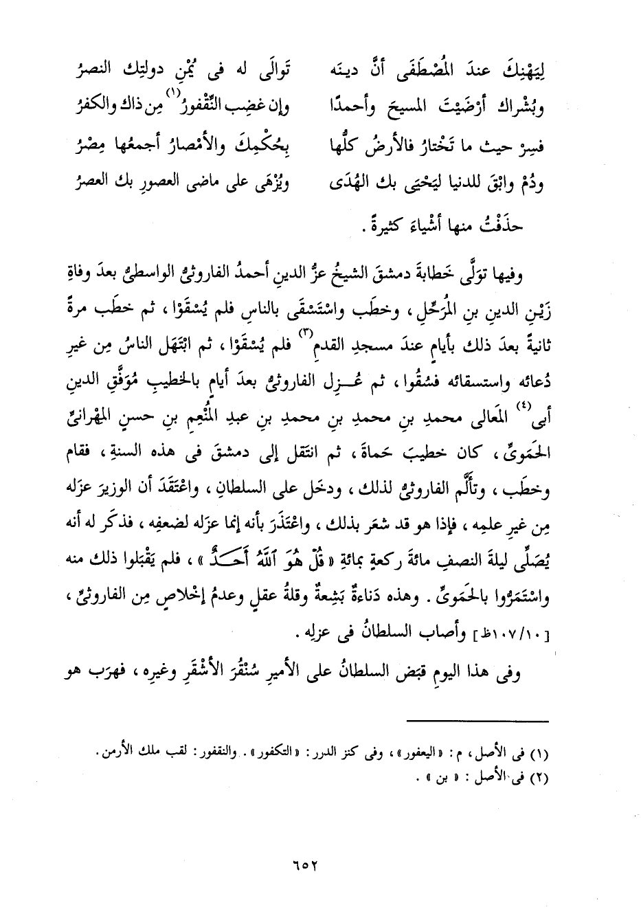 وَفِيهَا تَوَلَّى خَطَابَةَ دِمَشْقَ الشَّيْخُ عِزُّ الدِّينِ أَحْمَدُ الْفَارُوثِيُّ الْوَاسِطِيُّ بَعْدَ وَفَاةِ زَيْنِ الدِّينِ بْنِ الْمُرَحِّلِ، وَخَطْبَ وَاسْتَسْقَى بِالنَّاسِ فَلَمْ يُسْقَوْا، ثُمَّ خَطَبَ مَرَّةً ثَانِيَةً بَعْدَ ذَلِكَ بِأَيَّامٍ عِنْدَ مَسْجِدِ الْقَدَمِ فَلَمْ يُسْقَوا، ثُمَّ ابْتَهَلَ النَّاسُ مِنْ غَيْرِ دُعَائِهِ وَاسْتِسْقَائِهِ فَسُقُوا، ثُمَّ عُزِلَ الْفَارُوثِيُّ بَعْدَ أَيَّامٍ بِالْخَطِيبِ مُوَفَّقِ الدِّينِ أَبِي الْمَعَالِي مُحَمَّدِ بْنِ مُحَمَّدِ بْنِ مُحَمَّدِ بْنِ عَبْدِ الْمُنْعِمِ الْمِهْرَانِيِّ الْحَمَوِيِّ، كَانَ خَطِيبُ حَمَاةَ ثُمَّ انْتَقَلَ إِلَى دِمَشْقَ فِي هَذِهِ السَّنَةِ فَقَامَ وَخَطَبَ، وَتَأَلَّمَ الْفَارُوثِيُّ لِذَلِكَ، وَدَخَلَ عَلَى السُّلْطَانِ، وَاعْتَقَدَ أَنَّ الْوَزِيرَ عَزَلَهُ مِنْ غَيْرِ عِلْمِهِ، فَإِذَا هُوَ قَدْ شَعَرَ بِذَلِكَ، وَاعْتَذَرَ بِأَنَّهُ إِنَّمَا عَزَلَهُ لِضَعْفِهِ، فَذَكَرَ لَهُ أَنَّهُ يُصَلِّي لَيْلَةَ النِّصْفِ مِائَةَ رَكْعَةٍ بِمِائَةِ {قُلْ هُوَ اللَّهُ أَحَدٌ} [الإخلاص: 1] فَلَمْ يَقْبَلُوا ذَلِكَ مِنْهُ، وَاسْتَمَرُّوا بِالْحَمَوِيِّ. وَهَذِهِ دَنَاءَةٌ بَشِعَةٌ وَقِلَّةُ عَقْلٍ وَعَدَمُ إِخْلَاصٍ مِنَ الْفَارُوثِيِّ، وَأَصَابَ السُّلْطَانُ فِي عَزْلِهِ.