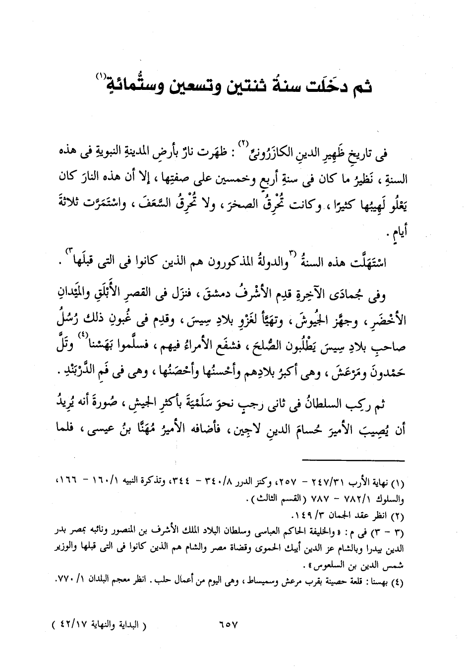 وَفِي جُمَادَى الْآخِرَةِ قَدِمَ الْأَشْرَفُ دِمَشْقَ، فَنَزَلَ فِي الْقَصْرِ الْأَبْلَقِ وَالْمَيْدَانِ الْأَخْضَرِ، وَجَهَّزَ الْجُيُوشَ، وَتَهَيَّأَ لِغَزْوِ بِلَادِ سِيسَ، وَقَدِمَ فِي غُبُونِ ذَلِكَ رُسُلُ صَاحِبِ بِلَادِ سِيسَ يَطْلُبُونَ الصُّلْحَ، فَشَفَعَ الْأُمَرَاءُ فِيهِمْ، فَسَلَّمُوا بَهْسَنَا وَتَلَّ حَمْدُونَ وَمَرْعَشَ، وَهِيَ أَكْبَرُ بِلَادِهِمْ وَأَحْسَنُهَا وَأَحْصَنُهَا، وَهِيَ فِي فَمِ الدَّرْبَنْدِ.