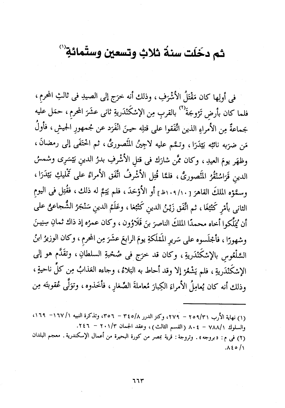 فِي أَوَّلِهَا كَانَ مَقْتَلُ الْأَشْرَفِ، وَذَلِكَ أَنَّهُ خَرَجَ إِلَى الصَّيْدِ فِي ثَالِثِ الْمُحَرَّمِ فَلَمَّا كَانَ بِأَرْضٍ تَرُوجَةَ بِالْقُرْبِ مِنَ الْإِسْكَنْدَرِيَّةِ ثَانِي عَشَرَ الْمُحَرَّمِ، حَمَلَ عَلَيْهِ جَمَاعَةٌ مِنَ الْأُمَرَاءِ الَّذِينَ اتَّفَقُوا عَلَى قَتْلِهِ حِينَ انْفَرَدَ عَنْ جُمْهُورِ الْجَيْشِ، فَأَوَّلُ مَنْ ضَرَبَهُ نَائِبُهُ بَيْدَرَا، وَتَمَّمَ عَلَيْهِ لَاجِينُ الْمَنْصُورِيُّ، ثُمَّ اخْتَفَى إِلَى رَمَضَانَ، وَظَهَرَ يَوْمَ الْعِيدِ، وَكَانَ مِمَّنْ شَارَكَ فِي قَتْلِ الْأَشْرَفِ بَدْرُ الدِّينِ بَيْسَرِيُّ وَشَمْسُ الدِّينِ قَرَاسُنْقُرُ الْمَنْصُورِيُّ، فَلَمَّا قُتِلَ الْأَشْرَفُ اتَّفَقَ الْأُمَرَاءُ عَلَى تَمْلِيكِ بَيْدَرَا، وَسَمَّوْهُ الْمَلِكَ الْقَاهِرَ أَوِ الْأَوْحَدَ، فَلَمْ يَتَمَّ لَهُ ذَلِكَ، فَقُتِلَ فِي الْيَوْمِ الثَّانِي بِأَمْرِ كَتْبُغَا، ثُمَّ اتَّفَقَ زَيْنُ الدِّينِ كَتْبُغَا، وَعَلَمُ الدِّينِ سَنْجَرُ الشُّجَاعِيُّ عَلَى أَنْ يُمَلِّكُوا أَخَاهُ مُحَمَّدًا الْمَلِكَ النَّاصِرَ بْنَ قَلَاوُونَ، وَكَانَ عُمْرُهُ إِذْ ذَاكَ ثَمَانِ سِنِينَ وَشُهُورًا، فَأَجْلَسُوهُ عَلَى سَرِيرِ الْمَمْلَكَةِ يَوْمَ الرَّابِعَ عَشَرَ مِنَ الْمُحَرَّمِ، وَكَانَ الْوَزِيرُ ابْنُ السَّلْعُوسِ بِالْإِسْكَنْدَرِيَّةِ، وَكَانَ قَدْ خَرَجَ فِي صُحْبَةِ السُّلْطَانِ، وَتَقَدَّمَ هُوَ إِلَى الْإِسْكَنْدَرِيَّةِ، فَلَمْ يَشْعُرْ إِلَّا وَقَدْ أَحَاطَ بِهِ الْبَلَاءُ، وَجَاءَهُ الْعَذَابُ مِنْ كُلِّ نَاحِيَةٍ، وَذَلِكَ أَنَّهُ كَانَ يُعَامِلُ الْأُمَرَاءَ الْكِبَارَ مُعَامَلَةَ الصِّغَارِ، فَأَخَذُوهُ، وَتَوَلَّى عُقُوبَتَهُ مِنْ