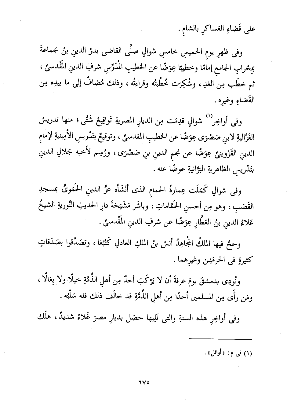وَفِي شَوَّالٍ كَمَلَتْ عِمَارَةُ الْحَمَّامِ الَّذِي أَنْشَاهُ عِزُّ الدِّينِ الْحَمَوِيُّ بِمَسْجِدِ الْقَصَبِ، وَهُوَ مِنْ أَحْسَنِ الْحَمَّامَاتِ، وَبَاشَرَ مَشْيَخَةَ دَارِ الْحَدِيثِ النُّورِيَّةِ الشَّيْخُ عَلَاءُ الدِّينِ بْنُ الْعَطَّارِ عِوَضًا عَنْ شَرَفِ الدِّينِ الْمَقْدِسِيِّ.
