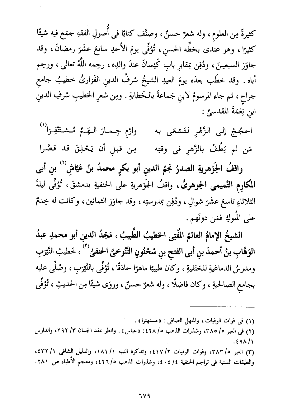 خَطِيبُ النَّيْرَبِ وَمُدَرِّسُ الدَّمَاغِيَّةِ لِلْحَنَفِيَّةِ، وَكَانَ طَبِيبًا مَاهِرًا حَاذِقًا، تُوُفِّيَ بِالنَّيْرَبِ وَصُلِّيَ عَلَيْهِ بِجَامِعِ الصَّالِحِيَّةِ، وَكَانَ فَاضِلًا، وَلَهُ شِعْرٌ حَسَنٌ، وَرَوَى شَيْئًا مِنَ الْحَدِيثِ، تُوُفِّيَ