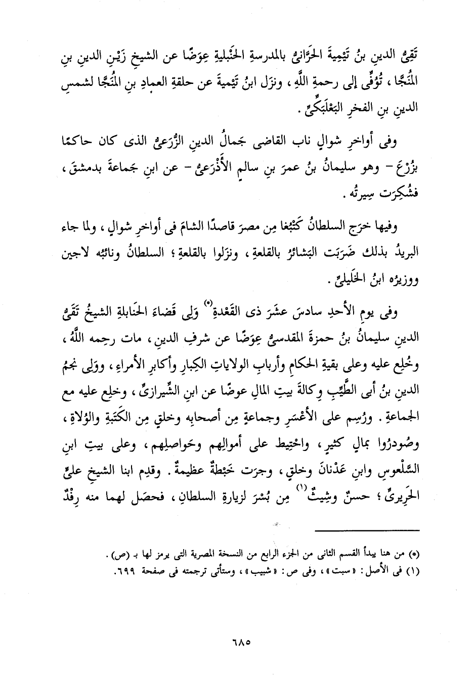 وَفِي يَوْمِ الْأَحَدِ سَادِسَ عَشَرَ ذِي الْقِعْدَةِ وَلِيَ قَضَاءَ الْحَنَابِلَةِ الشَّيْخُ تَقِيُّ الدِّينِ سُلَيْمَانُ بْنُ حَمْزَةَ الْمَقْدِسِيُّ عِوَضًا عَنْ شَرَفِ الدِّينِ، مَاتَ رَحِمَهُ اللَّهُ، وَخُلِعَ عَلَيْهِ وَعَلَى بَقِيَّةِ الْحُكَّامِ وَأَرْبَابِ الْوِلَايَاتِ الْكِبَارِ وَأَكَابِرِ الْأُمَرَاءِ، وَوَلِيَ نَجْمُ الدِّينِ بْنُ أَبِي الطَّيِّبِ وِكَالَةَ بَيْتِ الْمَالِ عِوَضًا عَنِ ابْنِ الشِّيرَازِيِّ، وَخُلِعَ عَلَيْهِ مَعَ الْجَمَاعَةِ. وَرُسِمَ عَلَى الْأَعْسَرِ وَجَمَاعَةٍ مِنْ أَصْحَابِهِ وَخَلْقٍ مِنَ الْكَتَبَةِ وَالْوُلَاةِ، وَصُودِرُوا بِمَالٍ كَثِيرٍ، وَاحْتِيطَ عَلَى أَمْوَالِهِمْ وَحَوَاصِلِهِمْ، وَعَلَى بَيْتِ ابْنِ السَّلْعُوسِ وَابْنِ عَدْنَانَ وَخَلْقٍ، وَجَرَتْ خَبْطَةٌ عَظِيمَةٌ. وَقَدِمَ ابْنَا الشَّيْخِ عَلِيٍّ الْحَرِيرِيِّ; حَسَنٌ وَشِيثٌ مِنْ بُسْرَ لِزِيَارَةِ السُّلْطَانِ، فَحَصَلَ لَهُمَا مِنْهُ رِفْدٌ