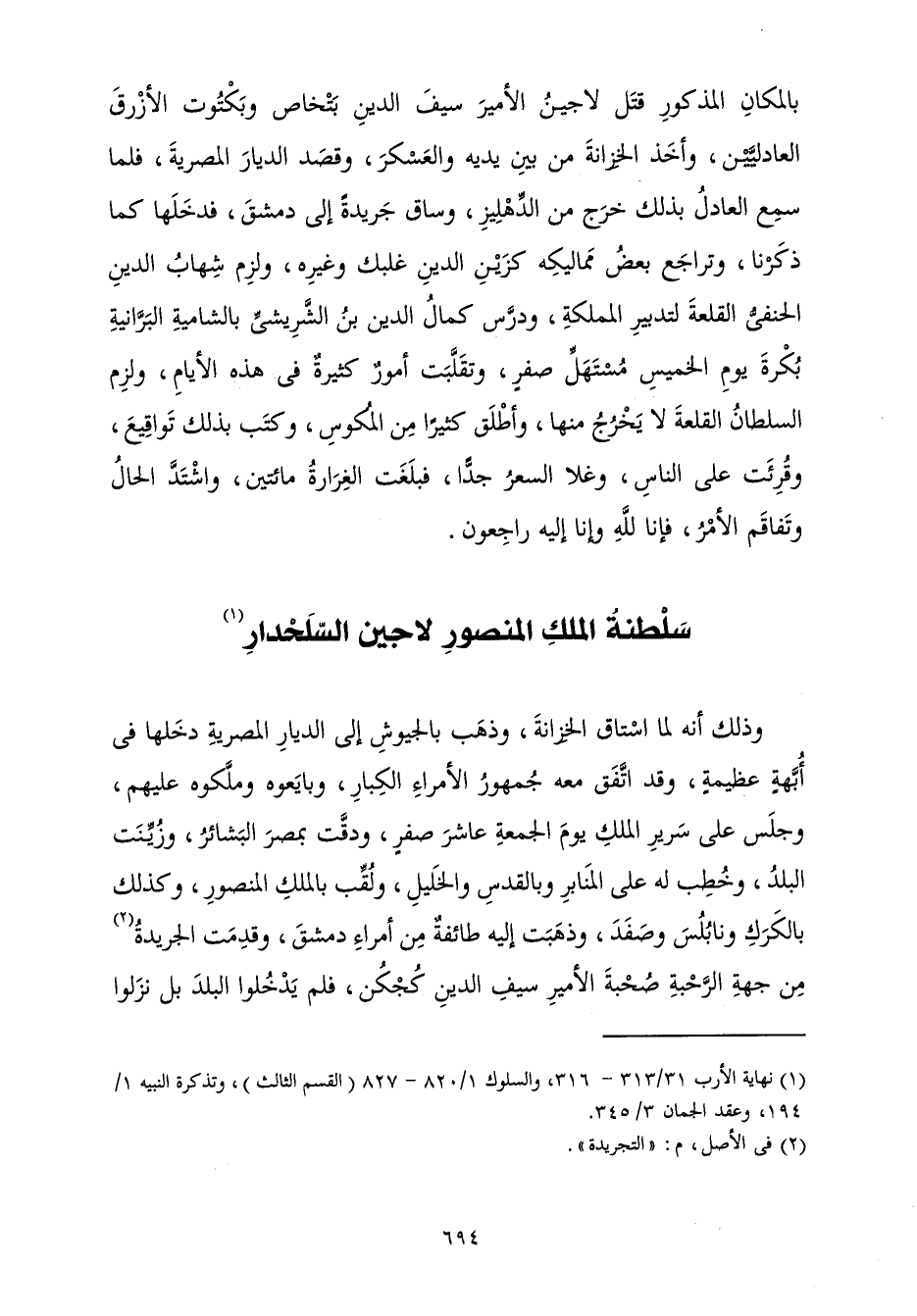 بِالْمَكَانِ الْمَذْكُورِ قَتَلَ لَاجِينُ الْأَمِيرَ سَيْفَ الدِّينِ بَتْخَاصَ وَبَكْتُوتَ الْأَزْرَقَ الْعَادِلِيَّيْنِ، وَأَخَذَ الْخِزَانَةَ مِنْ بَيْنِ يَدَيْهِ وَالْعَسْكَرَ، وَقَصَدَ الدِّيَارَ الْمِصْرِيَّةَ، فَلَمَّا سَمِعَ الْعَادِلُ بِذَلِكَ خَرَجَ مِنَ الدِّهْلِيزِ، وَسَاقَ جَرِيدَةً إِلَى دِمَشْقَ، فَدَخَلَهَا كَمَا ذَكَرْنَا، وَتَرَاجَعَ بَعْضُ مَمَالِيكِهِ كَزَيْنِ الدِّينِ غَلْبَكَ وَغَيْرِهِ، وَلَزِمَ شِهَابُ الدِّينِ الْحَنَفِيُّ الْقَلْعَةَ لِتَدْبِيرِ الْمَمْلَكَةِ، وَدَرَّسَ كَمَالُ الدِّينِ بْنُ الشَّرِيشِيِّ بِالشَّامِيَّةِ الْبَرَّانِيَّةِ بُكْرَةَ يَوْمِ الْخَمِيسِ مُسْتَهَلِّ صَفْرٍ، وَتَقَلَّبَتْ أُمُورٌ كَثِيرَةٌ فِي هَذِهِ الْأَيَّامِ، وَلَزِمَ السُّلْطَانُ الْقَلْعَةَ لَا يَخْرُجُ مِنْهَا، وَأَطْلَقَ كَثِيرًا مِنَ الْمُكُوسِ، وَكَتَبَ بِذَلِكَ تَوَاقِيعَ، وَقُرِئَتْ عَلَى النَّاسِ، وَغَلَا السِّعْرُ جِدًّا، فَبَلَغَتِ الْغِرَارَةُ مِائَتَيْنِ، وَاشْتَدَّ الْحَالُ وَتَفَاقَمَ الْأَمْرُ، فَإِنَّا لِلَّهِ وَإِنَّا إِلَيْهِ رَاجِعُونَ.