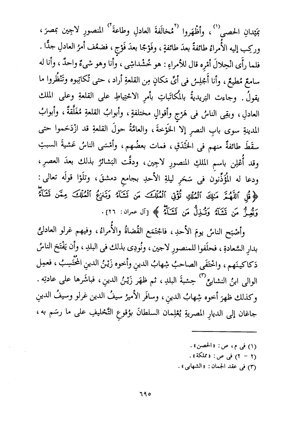 بِمَيْدَانَ الْحَصَى، وَأَظْهَرُوا مُخَالَفَةَ الْعَادِلِ وَطَاعَةَ الْمَنْصُورِ لَاجِينَ بِمِصْرَ، وَرَكِبَ إِلَيْهِ الْأُمَرَاءُ طَائِفَةً بَعْدَ طَائِفَةٍ، وَفَوْجًا بَعْدَ فَوْجٍ، فَضَعُفَ أَمْرُ الْعَادِلِ جِدًّا. فَلَمَّا رَأَى انْحِلَالَ أَمْرِهِ قَالَ لِلْأُمَرَاءِ: هُوَ خُشْدَاشِيٌّ، وَأَنَا وَهُوَ شَيْءٌ وَاحِدٌ، وَأَنَا لَهُ سَامِعٌ مُطِيعٌ، وَأَنَا أَجْلِسُ فِي أَيِّ مَكَانٍ مِنَ الْقَلْعَةِ أَرَادَ، حَتَّى تُكَاتِبُوهُ وَتَنْظُرُوا مَا يَقُولُ. وَجَاءَتِ الْبَرِيدِيَّةُ بِالْمُكَاتَبَاتِ بِأَمْرِ الِاحْتِيَاطِ عَلَى الْقَلْعَةِ وَعَلَى الْمَلِكِ الْعَادِلِ، وَبَقِيَ النَّاسُ فِي هَرْجٍ وَأَقْوَالٍ مُخْتَلِفَةٍ، وَأَبْوَابُ الْقَلْعَةِ مُغْلَقَةٌ، وَأَبْوَابُ الْمَدِينَةِ سِوَى بَابِ النَّصْرِ إِلَّا الْخَوْخَةَ، وَالْعَامَّةُ حَوْلَ الْقَلْعَةِ قَدِ ازْدَحَمُوا حَتَّى سَقَطَتْ طَائِفَةٌ مِنْهُمْ فِي الْخَنْدَقِ، فَمَاتَ بَعْضُهُمْ، وَأَمْسَى النَّاسُ عَشِيَّةَ السَّبْتِ، وَقَدْ أُعْلِنَ بِاسْمِ الْمَلِكِ الْمَنْصُورِ لَاجِينَ، وَدَقَّتِ الْبَشَائِرُ بِذَلِكَ بَعْدَ الْعَصْرِ، وَدَعَا لَهُ الْمُؤَذِّنُونَ فِي سَحَرِ لَيْلَةِ الْأَحَدِ بِجَامِعِ دِمَشْقَ، وَتَلَوْا قَوْلَهُ تَعَالَى: {قُلِ اللَّهُمَّ مَالِكَ الْمُلْكِ تُؤْتِي الْمُلْكَ مَنْ تَشَاءُ وَتَنْزِعُ الْمُلْكَ مِمَّنْ تَشَاءُ وَتُعِزُّ مَنْ تَشَاءُ وَتُذِلُّ مَنْ تَشَاءُ} [آل عمران: 26] .