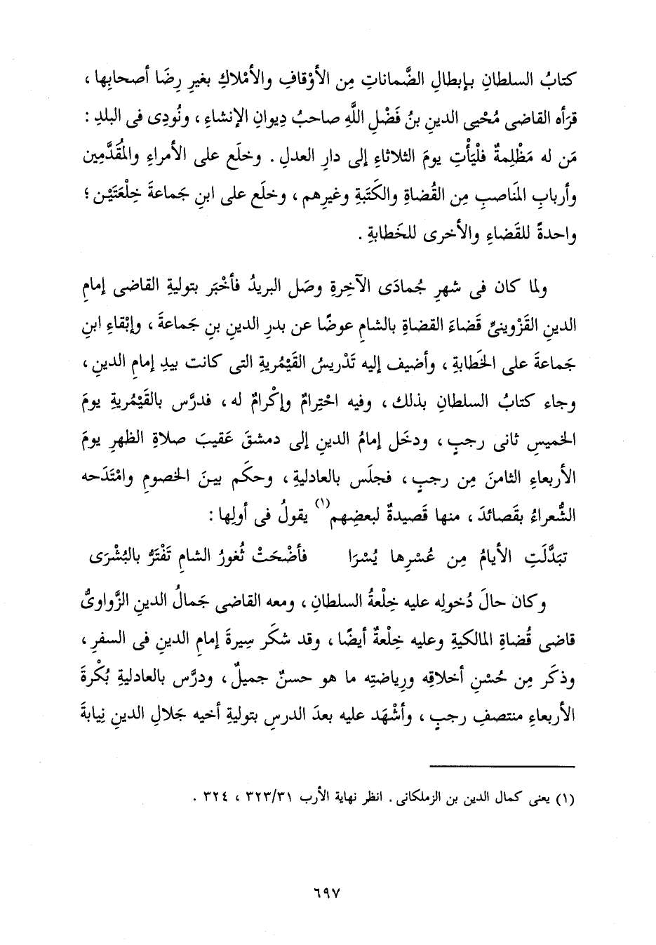 كِتَابُ السُّلْطَانِ بِإِبْطَالِ الضَّمَانَاتِ مِنَ الْأَوْقَافِ وَالْأَمْلَاكِ بِغَيْرِ رِضَا أَصْحَابِهَا، قَرَأَهُ الْقَاضِي مُحْيِي الدِّينِ بْنُ فَضْلِ اللَّهِ صَاحِبُ دِيوَانِ الْإِنْشَاءِ، وَنُودِيَ فِي الْبَلَدِ: مَنْ لَهُ مَظْلِمَةٌ فَلْيَأْتِ يَوْمَ الثُّلَاثَاءَ إِلَى دَارِ الْعَدْلِ. وَخَلَعَ عَلَى الْأُمَرَاءِ وَالْمُقَدَّمِينَ وَأَرْبَابِ الْمَنَاصِبِ مِنَ الْقُضَاةِ وَالْكَتَبَةِ وَغَيْرِهِمْ، وَخَلَعَ عَلَى ابْنِ جَمَاعَةَ خِلْعَتَيْنِ; وَاحِدَةً لِلْقَضَاءِ وَالْأُخْرَى لِلْخَطَابَةِ.