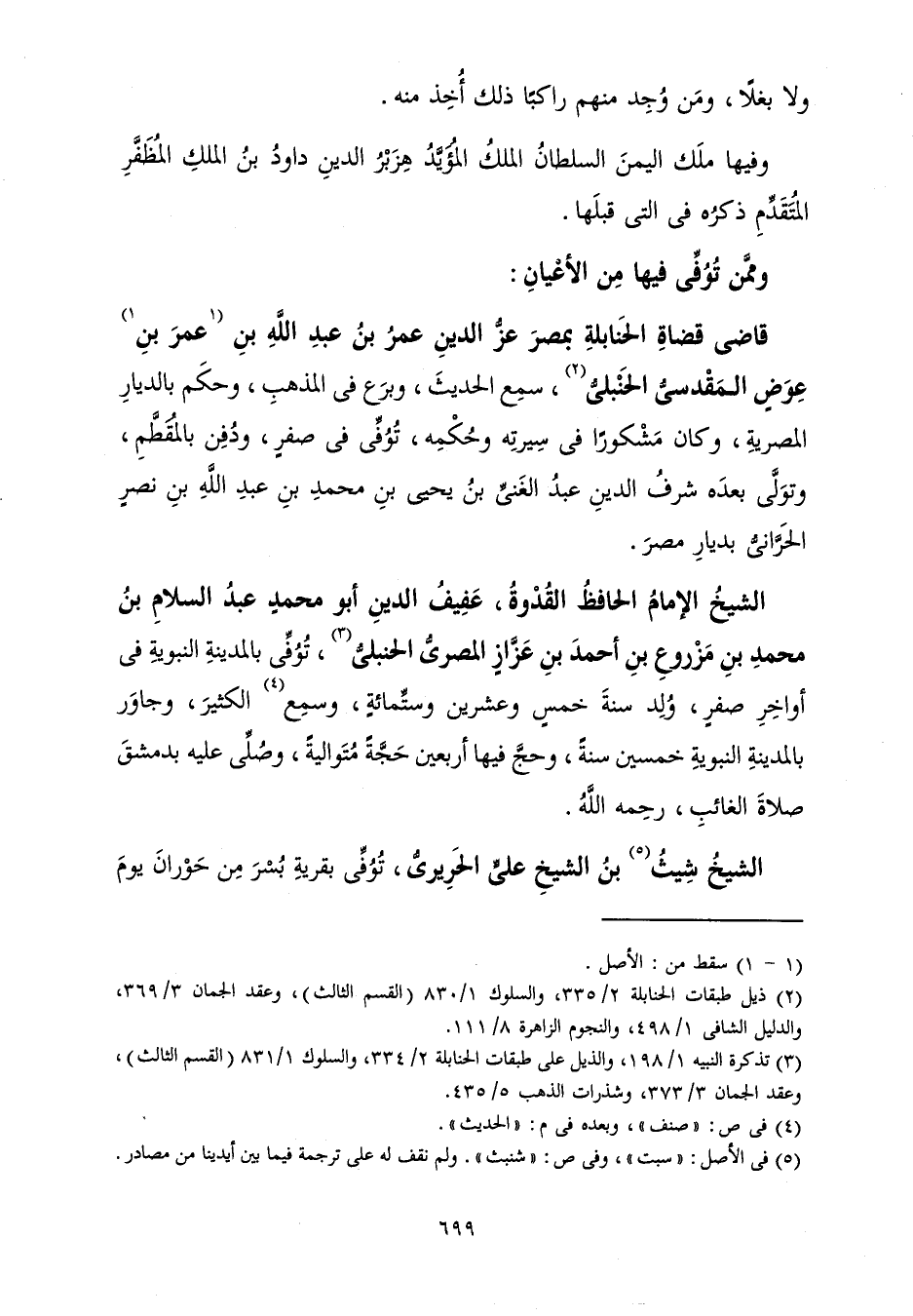 قَاضِي قُضَاةِ الْحَنَابِلَةِ بِمِصْرَ عِزُّ الدِّينِ عُمَرُ بْنُ عَبْدِ اللَّهِ بْنِ عُمَرَ بْنِ عِوَضٍ الْمَقْدِسِيُّ الْحَنْبَلِيُّ