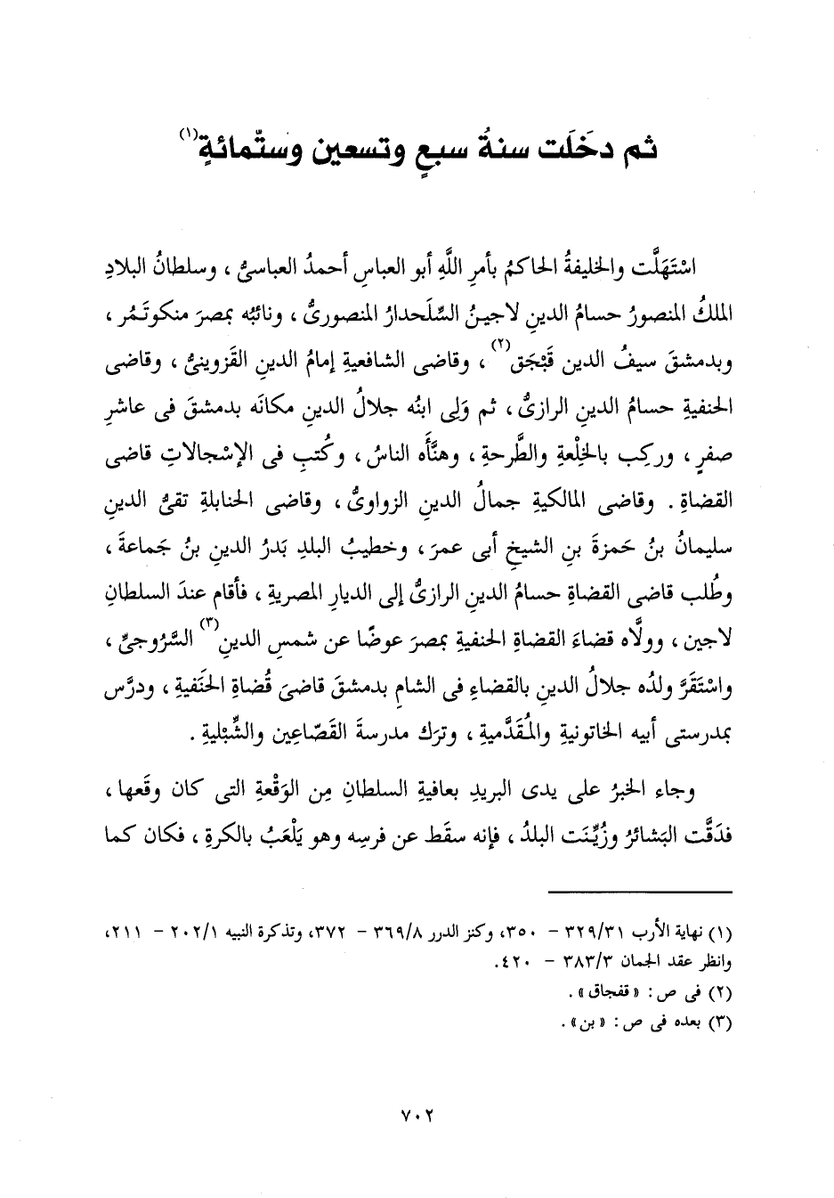 اسْتَهَلَّتْ وَالْخَلِيفَةُ الْحَاكِمُ بِأَمْرِ اللَّهِ أَبُو الْعَبَّاسِ أَحْمَدُ الْعَبَّاسِيُّ، وَسُلْطَانُ الْبِلَادِ الْمَلِكُ الْمَنْصُورُ حُسَامُ الدِّينِ لَاجِينُ السِّلَحْدَارِيُّ الْمَنْصُورِيُّ، وَنَائِبُهُ بِمِصْرَ مَنْكُوتَمُرُ، وَبِدِمَشْقَ سَيْفُ الدِّينِ قَبْجَقُ، وَقَاضِي الشَّافِعِيَّةِ إِمَامُ الدِّينِ الْقَزْوِينِيُّ، وَقَاضِي الْحَنَفِيَّةِ حُسَامُ الدِّينِ الرَّازِيُّ، ثُمَّ وَلِيَ ابْنُهُ جَلَالُ الدِّينِ مَكَانَهُ بِدِمَشْقَ فِي عَاشِرِ صَفَرٍ، وَرَكِبَ بِالْخِلْعَةِ وَالطَّرْحَةِ، وَهَنَّأَهُ النَّاسُ، وَكُتِبَ فِي الْإِسْجَالَاتِ قَاضِي الْقُضَاةِ. وَقَاضِي الْمَالِكِيَّةِ جَمَالُ الدِّينِ الزَّوَاوِيُّ، وَقَاضِي الْحَنَابِلَةِ تَقِيُّ الدِّينِ سُلَيْمَانُ بْنُ حَمْزَةَ بْنِ الشَّيْخِ أَبِي عُمَرَ، وَخَطِيبُ الْبَلَدِ بَدْرُ الدِّينِ بْنُ جَمَاعَةَ، وَطُلِبَ قَاضِي الْقُضَاةِ حُسَامُ الدِّينِ الرَّازِيُّ إِلَى الدِّيَارِ الْمِصْرِيَّةِ، فَأَقَامَ عِنْدَ السُّلْطَانِ لَاجِينَ وَوَلَّاهُ قَضَاءَ الْقُضَاةِ الْحَنَفِيَّةِ بِمِصْرَ عِوَضًا عَنْ شَمْسِ الدِّينِ السُّرُوجِيِّ، وَاسْتَقَرَّ وَلَدُهُ جَلَالُ الدِّينِ بِالْقَضَاءِ فِي الشَّامِ بِدِمَشْقَ قَاضِي قُضَاةِ الْحَنَفِيَّةِ، وَدَرَّسَ بِمَدْرَسَتَيْ أَبِيهِ الْخَاتُونِيَّةِ وَالْمُقَدَّمِيَّةِ، وَتَرَكَ مَدْرَسَةَ الْقَصَّاعِينَ وَالشِّبْلِيَّةِ.