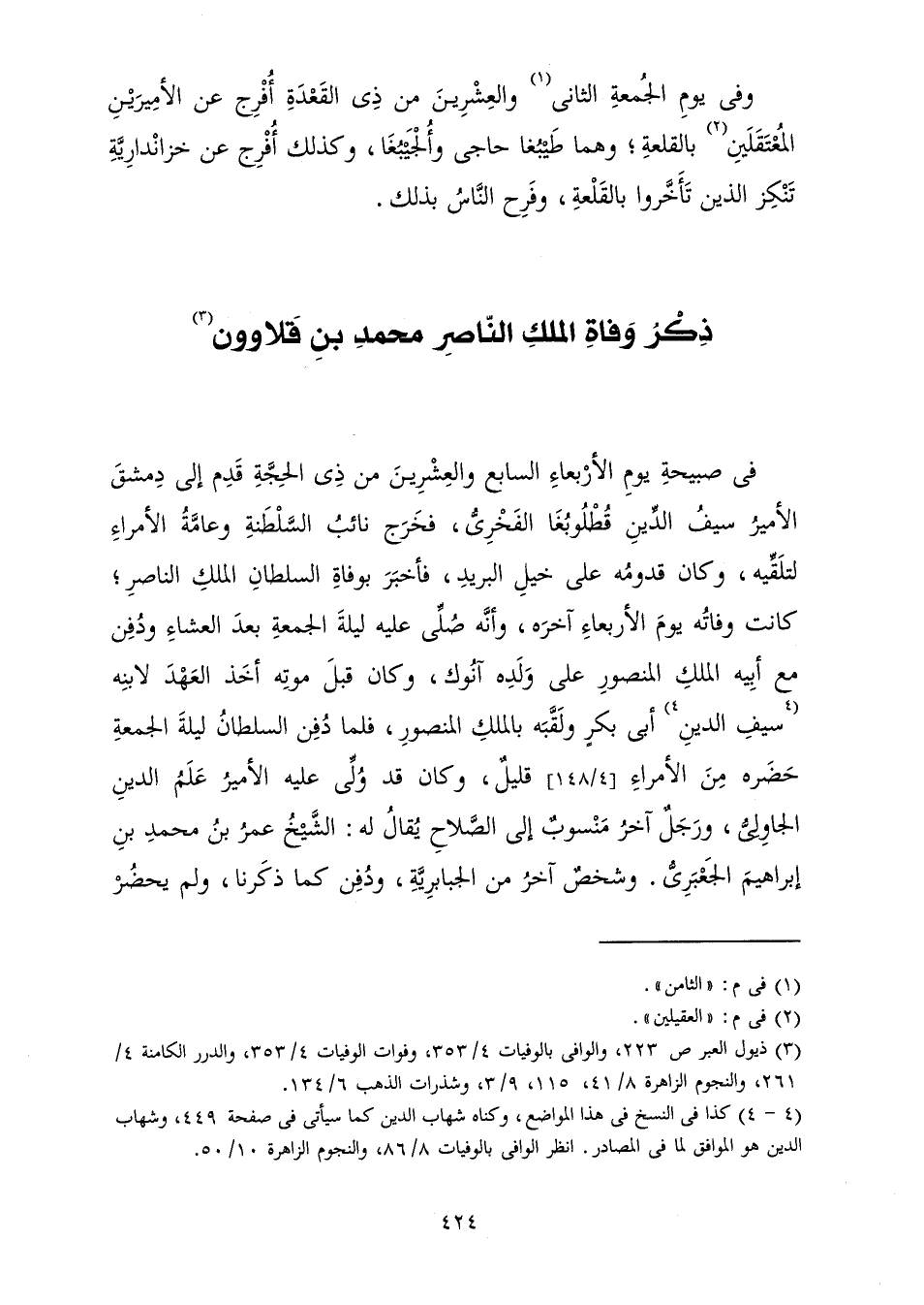 فِي صَبِيحَةِ يَوْمِ الْأَرْبِعَاءِ السَّابِعِ وَالْعِشْرِينَ مِنْ ذِي الْحِجَّةِ قَدِمَ إِلَى دِمَشْقَ الْأَمِيرُ سَيْفُ الدِّينِ قُطْلُوبُغَا الْفَخْرِيُّ، فَخَرَجَ نَائِبُ السَّلْطَنَةِ وَعَامَّةُ الْأُمَرَاءِ لِتَلَقِّيهِ، وَكَانَ قُدُومُهُ عَلَى خَيْلِ الْبَرِيدِ، فَأَخْبَرَ بِوَفَاةِ السُّلْطَانِ الْمَلَكِ النَّاصِرِ - كَانَتْ وَفَاتُهُ يَوْمَ الْأَرْبِعَاءِ آخِرَهُ - وَأَنَّهُ صُلِّيَ عَلَيْهِ لَيْلَةَ الْجُمُعَةِ بَعْدَ الْعِشَاءِ، وَدُفِنَ مَعَ أَبِيهِ الْمَلِكِ الْمَنْصُورِ عَلَى وَلَدِهِ آنُوكَ، وَكَانَ قَبْلَ مَوْتِهِ أَخَذَ الْعَهْدَ لِابْنِهِ سَيْفِ الدِّينِ أَبِي بَكْرٍ وَلَقَّبَهُ بِالْمَلِكِ الْمَنْصُورِ، فَلَمَّا دُفِنَ السُّلْطَانُ لَيْلَةَ الْجُمُعَةِ حَضَرَهُ مِنَ الْأُمَرَاءِ قَلِيلٌ، وَكَانَ قَدْ وُلِّيَ عَلَيْهِ الْأَمِيرُ عَلَمُ الدِّينِ الْجَاوِلِيُّ، وَرَجُلٌ آخَرُ مَنْسُوبٌ إِلَى الصَّلَاحِ يُقَالُ لَهُ: الشَّيْخُ عُمَرُ بْنُ مُحَمَّدِ بْنِ إِبْرَاهِيمَ الْجَعْبَرِيُّ، وَشَخْصٌ آخَرُ مِنَ الْجَبَابِرِيَّةِ، وَدُفِنَ كَمَا ذَكَرْنَا، وَلَمْ يَحْضُرْ