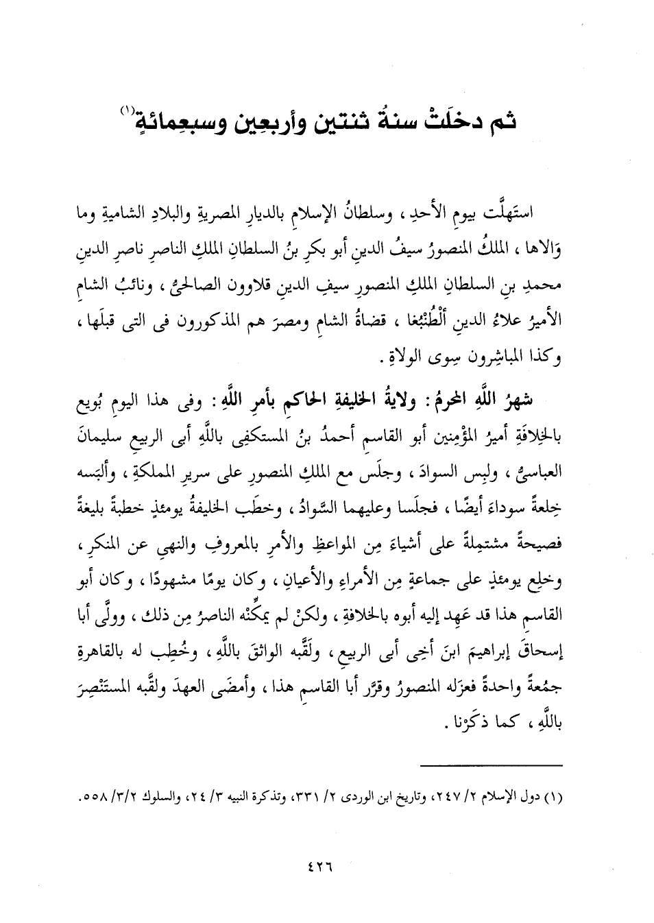 شَهْرُ اللَّهِ الْمُحَرَّمُ: وِلَايَةُ الْخَلِيفَةِ الْحَاكِمِ بِأَمْرِ اللَّهِ: وَفِي هَذَا الْيَوْمِ بُويِعَ بِالْخِلَافَةِ أَمِيرُ الْمُؤْمِنِينَ أَبُو الْقَاسِمِ أَحْمَدُ بْنُ الْمُسْتَكْفِي بِاللَّهِ أَبِي الرَّبِيعِ سُلَيْمَانَ الْعَبَّاسِيُّ، وَلَبِسَ السَّوَادَ، وَجَلَسَ مَعَ الْمَلِكِ الْمَنْصُورِ عَلَى سَرِيرِ الْمَمْلَكَةِ، وَأَلْبَسُهُ خِلْعَةً سَوْدَاءَ أَيْضًا، فَجَلَسَا وَعَلَيْهِمَا السَّوَادُ، وَخَطَبَ الْخَلِيفَةُ يَوْمَئِذٍ خُطْبَةً بَلِيغَةً فَصِيحَةً مُشْتَمِلَةً عَلَى أَشْيَاءَ مِنَ الْمَوَاعِظِ، وَالْأَمْرِ بِالْمَعْرُوفِ، وَالنَّهْيِ عَنِ الْمُنْكَرِ، وَخَلَعَ يَوْمَئِذٍ عَلَى جَمَاعَةٍ مِنَ الْأُمَرَاءِ وَالْأَعْيَانِ، وَكَانَ يَوْمًا مَشْهُودًا، وَكَانَ أَبُو الْقَاسِمِ هَذَا قَدْ عَهِدَ إِلَيْهِ أَبُوهُ بِالْخِلَافَةِ، وَلَكِنْ لَمْ يُمَكِّنْهُ النَّاصِرُ مِنْ ذَلِكَ، وَوَلَّى أَبَا إِسْحَاقَ إِبْرَاهِيمَ ابْنَ أَخِي أَبِي الرَّبِيعِ، وَلَقَّبَهُ الْوَاثِقَ بِاللَّهِ، وَخُطِبَ لَهُ بِالْقَاهِرَةِ جُمْعَةً وَاحِدَةً، فَعَزَلَهُ الْمَنْصُورُ، وَقَرَّرَ أَبَا الْقَاسِمِ هَذَا، وَأَمْضَى الْعَهْدَ، وَلَقَّبَهُ الْمُسْتَنْصِرَ بِاللَّهِ، كَمَا ذَكَرْنَا.