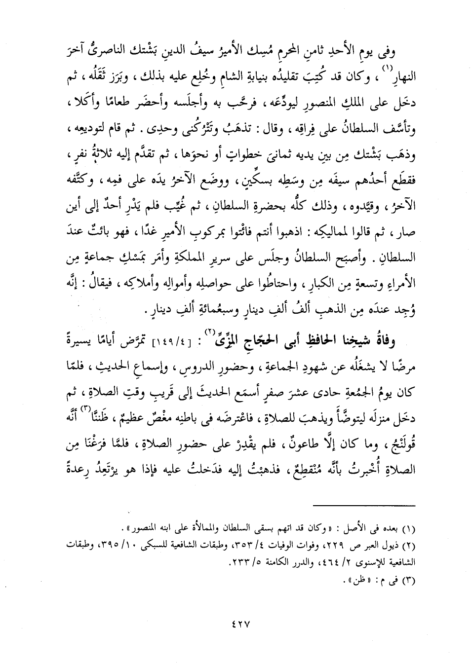 وَفَاةُ شَيْخِنَا الْحَافِظِ أَبِي الْحَجَّاجِ الْمِزِّيِّ: تَمَرَّضَ أَيَّامًا يَسِيرَةً مَرَضًا لَا يَشْغَلُهُ عَنْ شُهُودِ الْجَمَاعَةِ، وَحُضُورِ الدُّرُوسِ، وَإِسْمَاعِ الْحَدِيثِ، فَلَمَّا كَانَ يَوْمُ الْجُمُعَةِ حَادِيَ عَشَرَ صَفَرٍ أَسْمَعَ الْحَدِيثَ إِلَى قَرِيبِ وَقْتِ الصَّلَاةِ، ثُمَّ دَخَلَ مَنْزِلَهُ لِيَتَوَضَّأَ وَيَذْهَبَ لِلصَّلَاةِ، فَاعْتَرَضَهُ فِي بَاطِنِهِ مَغَصٌ عَظِيمٌ، ظَنَنَّا أَنَّهُ قُولَنْجُ، وَمَا كَانَ إِلَّا طَاعُونًا، فَلَمْ يَقْدِرْ عَلَى حُضُورِ الصَّلَاةِ، فَلَمَّا فَرَغْنَا مِنَ الصَّلَاةِ أُخْبِرْتُ بِأَنَّهُ مُنْقَطِعٌ، فَذَهَبْتُ إِلَيْهِ، فَدَخَلْتُ عَلَيْهِ فَإِذَا هُوَ يَرْتَعِدُ رِعْدَةً