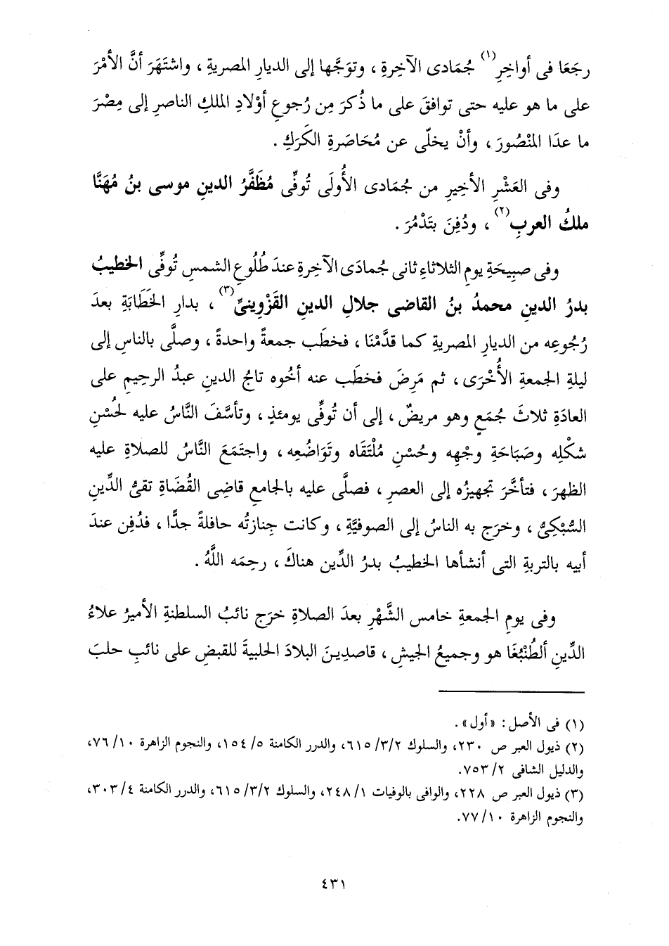 وَفِي الْعَشْرِ الْأَخِيرِ مِنْ جُمَادَى الْأُولَى تُوُفِّيَ مُظَفَّرُ الدِّينِ مُوسَى بْنُ مُهَنَّا مَلِكُ الْعَرَبِ، وَدُفِنَ بِتَدْمُرَ.