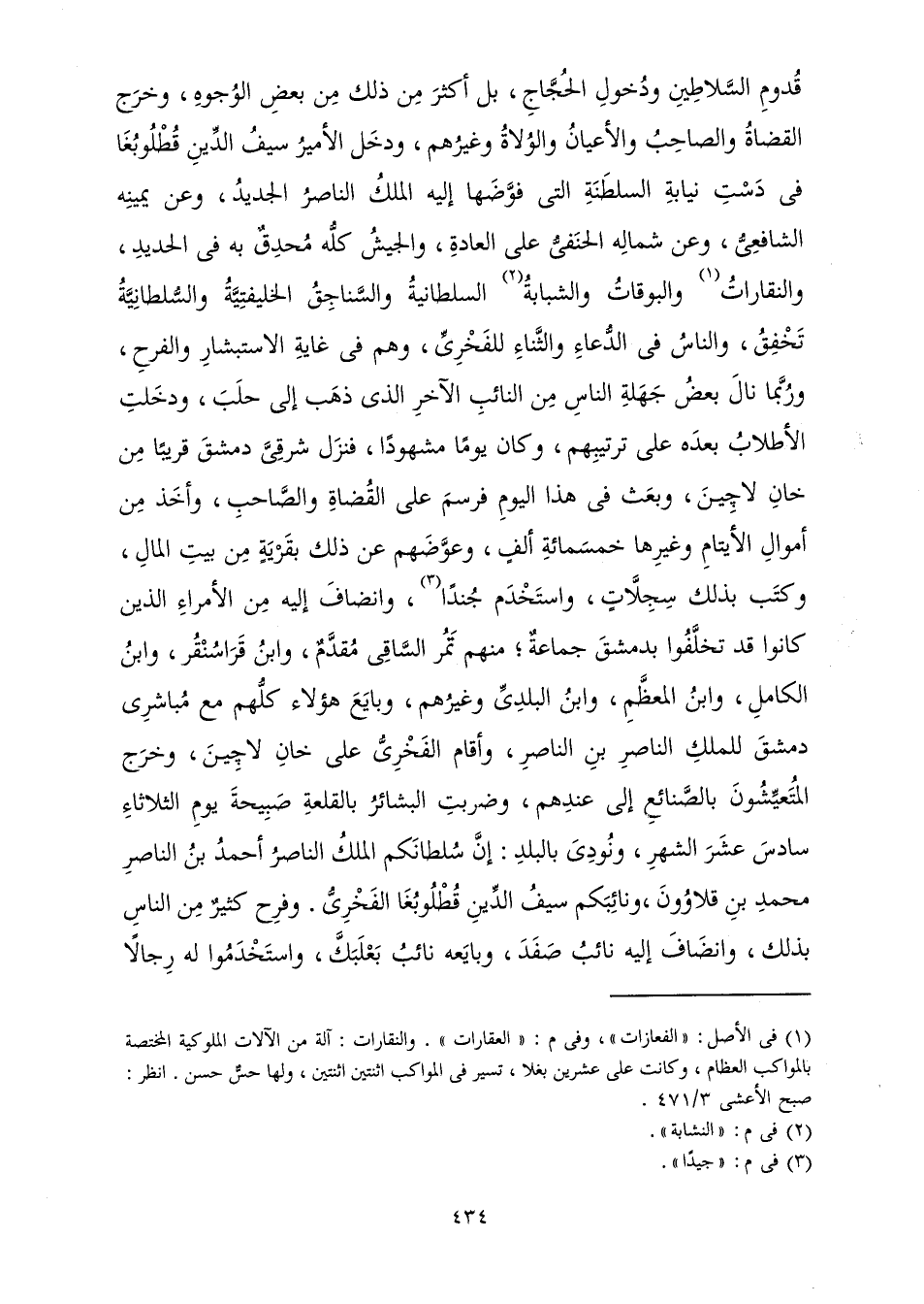 قُدُومِ السَّلَاطِينِ وَدُخُولِ الْحُجَّاجِ، بَلْ أَكْثَرَ مِنْ ذَلِكَ مِنْ بَعْضِ الْوُجُوهِ، وَخَرَجَ الْقُضَاةُ، وَالصَّاحِبُ، وَالْأَعْيَانُ، وَالْوُلَاةُ، وَغَيْرُهُمْ، وَدَخَلَ الْأَمِيرُ سَيْفُ الدِّينِ قُطْلُوبُغَا فِي دَسْتِ نِيَابَةِ السَّلْطَنَةِ الَّتِي فَوَّضَهَا إِلَيْهِ الْمَلِكُ النَّاصِرُ الْجَدِيدُ، وَعَنْ يَمِينِهِ الشَّافِعِيُّ، وَعَنْ شَمَالِهِ الْحَنَفِيُّ عَلَى الْعَادَةِ، وَالْجَيْشُ كُلُّهُ مُحْدِقٌ بِهِ فِي الْحَدِيدِ. وَالنُّقَّارَاتُ، وَالْبُوقَاتُ، وَالشَّبَّابَةُ السُّلْطَانِيَّةُ، وَالسَّنَاجِقُ الْخَلِيفَتِيَّةُ وَالسُّلْطَانِيَّةُ تَخْفِقُ، وَالنَّاسُ فِي الدُّعَاءِ وَالثَّنَاءِ لِلْفَخْرِيِّ، وَهُمْ فِي غَايَةِ الِاسْتِبْشَارِ وَالْفَرَحِ، وَرُبَّمَا نَالَ بَعْضُ جَهَلَةِ النَّاسِ مِنَ النَّائِبِ الْآخَرِ الَّذِي ذَهَبَ إِلَى حَلَبَ، وَدَخَلَتِ الْأَطْلَابُ بَعْدَهُ عَلَى تَرْتِيبِهِمْ، وَكَانَ يَوْمًا مَشْهُودًا، فَنَزَلَ شَرْقِيَّ دِمَشْقَ قَرِيبًا مِنْ خَانِ لَاجِينَ، وَبَعَثَ فِي هَذَا الْيَوْمِ، فَرَسَمَ عَلَى الْقُضَاةِ وَالصَّاحِبِ، وَأَخَذَ مِنْ أَمْوَالِ الْأَيْتَامِ وَغَيْرِهَا خَمْسَمِائَةِ أَلْفٍ، وَعَوَّضَهُمْ عَنْ ذَلِكَ بِقَرْيَةٍ مِنْ بَيْتِ الْمَالِ، وَكَتَبَ بِذَلِكَ سِجِلَّاتٍ، وَاسْتَخْدَمَ جُنْدًا، وَانْضَافَ إِلَيْهِ مِنَ الْأُمَرَاءِ الَّذِينَ كَانُوا قَدْ تَخَلَّفُوا بِدِمَشْقَ جَمَاعَةٌ; مِنْهُمْ تَمُرُ السَّاقِي مُقَدَّمٌ، وَابْنُ قَرَاسُنْقُرَ، وَابْنُ الْكَامِلِ، وَابْنُ الْمُعَظَّمِ، وَابْنُ الْبَلَدِيِّ وَغَيْرُهُمْ، وَبَايَعَ هَؤُلَاءِ كُلُّهُمْ مَعَ مُبَاشِرِي دِمَشْقَ لِلْمَلِكِ النَّاصِرِ ابْنِ النَّاصِرِ، وَأَقَامَ الْفَخْرِيُّ عَلَى خَانِ لَاجِينَ، وَخَرَجَ الْمُتَعَيِّشُونَ بِالصَّنَائِعِ إِلَى عِنْدِهِمْ، وَضُرِبَتِ الْبَشَائِرُ بِالْقَلْعَةِ صَبِيحَةَ يَوْمِ الثُّلَاثَاءِ سَادِسَ عَشَرَ الشَّهْرِ، وَنُودِيَ بِالْبَلَدِ: إِنَّ سُلْطَانَكُمُ الْمَلِكُ النَّاصِرُ أَحْمَدُ بْنُ النَّاصِرِ مُحَمَّدِ بْنِ قَلَاوُونَ، وَنَائِبَكُمْ سَيْفُ الدِّينِ قُطْلُوبُغَا الْفَخْرِيُّ، وَفَرِحَ كَثِيرٌ مِنَ النَّاسِ بِذَلِكَ، وَانْضَافَ إِلَيْهِ نَائِبُ صَفَدَ، وَبَايَعَهُ نَائِبُ بَعْلَبَكَّ، وَاسْتَخْدَمُوا لَهُ رِجَالًا