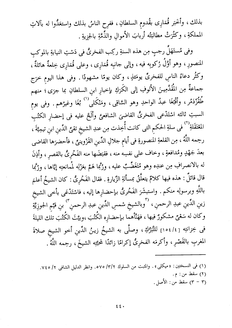 وَفِي مُسْتَهَلِّ رَجَبٍ مِنْ هَذِهِ السَّنَةِ رَكِبَ الْفَخْرِيُّ فِي دَسْتِ النِّيَابَةِ بِالْمَوْكِبِ الْمَنْصُورِ - وَهُوَ أَوَّلُ رُكُوبِهِ فِيهِ - وَإِلَى جَانِبِهِ قُمَارِيُّ، وَعَلَى قُمَارِيِّ خِلْعَةٌ هَائِلَةٌ، وَكَثُرَ دُعَاءُ النَّاسِ لِلْفَخْرِيِّ يَوْمَئِذٍ، وَكَانَ يَوْمًا مَشْهُودًا. وَفِي هَذَا الْيَوْمِ خَرَجَ جَمَاعَةٌ مِنَ الْمُقَدَّمِينَ الْأُلُوفِ إِلَى الْكَرَكِ بِإِخْبَارِ ابْنِ السُّلْطَانِ بِمَا جَرَى، مِنْهُمْ طُقُزْدَمُرُ، وَأَقْبُغَا عَبْدُ الْوَاحِدِ - وَهُوَ السَّاقِي - وَمَنْكَلِي بُغَا، وَغَيْرُهُمْ. وَفِي يَوْمِ السَّبْتِ ثَالِثِهِ اسْتَدْعَى الْفَخْرِيُّ الْقَاضِيَ الشَّافِعِيَّ، وَأَلَحَّ عَلَيْهِ فِي إِحْضَارِ الْكُتُبِ الْمُعْتَقَلَةِ فِي سَلَّةِ الْحُكْمِ الَّتِي كَانَتْ أُخِذَتْ مِنْ عِنْدِ الشَّيْخِ تَقِيِّ الدِّينِ ابْنِ تَيْمِيَةَ - رَحِمَهُ اللَّهُ - مِنَ الْقَلْعَةِ الْمَنْصُورَةِ فِي أَيَّامِ جَلَالِ الدِّينِ الْقَزْوِينِيِّ، فَأَحْضَرَهَا الْقَاضِي بَعْدَ جَهْدٍ وَمُدَافَعَةٍ، وَخَافَ عَلَى نَفْسِهِ مِنْهُ، فَقَبَضَهَا مِنْهُ الْفَخْرِيُّ بِالْقَصْرِ، وَأَذِنَ لَهُ فِي الِانْصِرَافِ مِنْ عِنْدِهِ وَهُوَ مُتَغَضِّبٌ عَلَيْهِ، وَرُبَّمَا هَمَّ بِعَزْلِهِ لِمُمَانَعَتِهِ إِيَّاهَا، وَرُبَّمَا قَالَ قَائِلٌ: هَذِهِ فِيهَا كَلَامٌ يَتَعَلَّقُ بِمَسْأَلَةِ الزِّيَارَةِ، فَقَالَ الْفَخْرِيُّ: كَانَ الشَّيْخُ أَعْلَمَ بِاللَّهِ وَبِرَسُولِهِ مِنْكُمْ. وَاسْتَبْشَرَ الْفَخْرِيُّ بِإِحْضَارِهَا إِلَيْهِ، فَاسْتَدْعَى بِأَخِي الشَّيْخِ زَيْنِ الدِّينِ عَبْدِ الرَّحْمَنِ، وَبِالشَّيْخِ شَمْسِ الدِّينِ عَبْدِ الرَّحْمَنِ بْنِ قَيِّمِ الْجَوْزِيَّةِ - وَكَانَ لَهُ سَعْيٌ مَشْكُورٌ فِيهَا - فَهَنَّأَهُمَا بِإِحْضَارِهِ الْكُتُبَ، وَبَيَّتَ الْكُتُبَ تِلْكَ اللَّيْلَةَ فِي خِزَانَتِهِ لِلتَّبَرُّكِ، وَصَلَّى بِهِ الشَّيْخُ زَيْنُ الدِّينِ أَخُو الشَّيْخِ صَلَاةَ الْمَغْرِبِ بِالْقَصْرِ، وَأَكْرَمَهُ الْفَخْرِيُّ إِكْرَامًا زَائِدًا; لِمَحَبَّتِهِ الشَّيْخَ، رَحِمَهُ اللَّهُ.