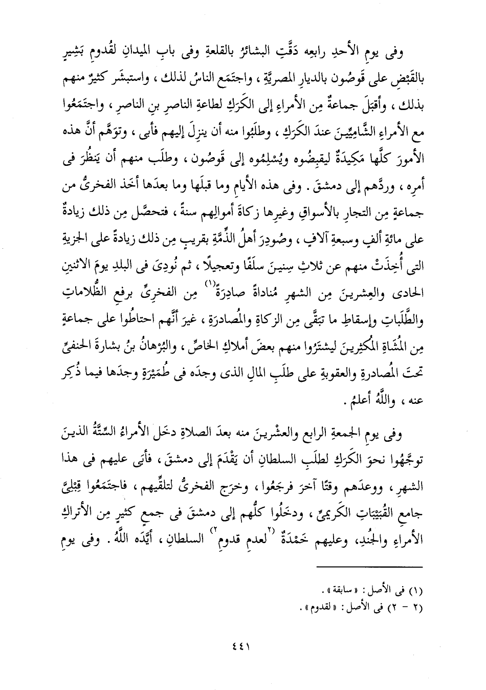 وَفِي يَوْمِ الْأَحَدِ رَابِعِهِ دَقَّتِ الْبَشَائِرُ بِالْقَلْعَةِ وَفِي بَابِ الْمَيْدَانِ; لِقُدُومِ بَشِيرٍ بِالْقَبْضِ عَلَى قُوصُونَ بِالدِّيَارِ الْمِصْرِيَّةِ، وَاجْتَمَعَ النَّاسُ لِذَلِكَ، وَاسْتَبْشَرَ كَثِيرٌ مِنْهُمْ بِذَلِكَ، وَأَقْبَلَ جَمَاعَةٌ مِنَ الْأُمَرَاءِ إِلَى الْكَرَكِ لِطَاعَةِ النَّاصِرِ ابْنِ النَّاصِرِ، وَاجْتَمَعُوا مَعَ الْأُمَرَاءِ الشَّامِيِّينَ عِنْدَ الْكَرَكِ، وَطَلَبُوا مِنْهُ أَنَّ يَنْزِلَ إِلَيْهِمْ فَأَبَى، وَتَوَهَّمَ أَنَّ هَذِهِ الْأُمُورَ كُلَّهَا مَكِيدَةٌ لِيَقْبِضُوهُ وَيُسَلِّمُوهُ إِلَى قُوصُونَ، وَطَلَبَ مِنْهُمْ أَنْ يَنْظُرَ فِي أَمْرِهِ، وَرَدَّهُمْ إِلَى دِمَشْقَ. وَفِي هَذِهِ الْأَيَّامِ وَمَا قَبْلَهَا وَمَا بَعْدَهَا أَخَذَ الْفَخْرِيُّ مِنْ جَمَاعَةٍ مِنَ التُّجَّارِ بِالْأَسْوَاقِ وَغَيْرِهَا زَكَاةَ أَمْوَالِهِمْ سَنَةً، فَتَحَصَّلَ مِنْ ذَلِكَ زِيَادَةٌ عَلَى مِائَةِ أَلْفٍ وَسَبْعَةِ آلَافٍ، وَصُودِرَ أَهْلُ الذِّمَّةِ بِقَرِيبٍ مِنْ ذَلِكَ زِيَادَةً عَلَى الْجِزْيَةِ الَّتِي أُخِذَتْ مِنْهُمْ عَنْ ثَلَاثِ سِنِينَ سَلَفًا وَتَعْجِيلًا، ثُمَّ نُودِيَ فِي الْبَلَدِ يَوْمَ الِاثْنَيْنِ الْحَادِيَ وَالْعِشْرِينَ مِنَ الشَّهْرِ مُنَادَاةٌ صَادِرَةٌ مِنَ الْفَخْرِيِّ بِرَفْعِ الظُّلَامَاتِ وَالطَّلَبَاتِ، وَإِسْقَاطِ مَا تَبَقَّى مِنَ الزَّكَاةِ وَالْمُصَادَرَةِ، غَيْرَ أَنَّهُمُ احْتَاطُوا عَلَى جَمَاعَةٍ مِنَ الْمُشَاةِ الْمُكْثِرِينَ لِيَشْتَرُوا مِنْهُمْ بَعْضَ أَمْلَاكِ الْخَاصِّ، وَالْبُرْهَانُ بْنُ بِشَارَةَ الْحَنَفِيُّ تَحْتَ الْمُصَادَرَةِ وَالْعُقُوبَةِ عَلَى طَلَبِ الْمَالِ الَّذِي وَجَدَهُ فِي طُمَيْرَةٍ وَجَدَهَا فِيمَا ذُكِرَ عَنْهُ، وَاللَّهُ أَعْلَمُ.