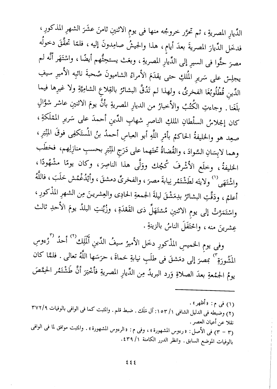 الدِّيَارِ الْمِصْرِيَّةِ، ثُمَّ تَحَرَّرَ خُرُوجُهُ مِنْهَا فِي يَوْمِ الِاثْنَيْنِ ثَامِنَ عَشَرَ الشَّهْرِ الْمَذْكُورِ، فَدَخَلَ الدِّيَارَ الْمِصْرِيَّةَ بَعْدَ أَيَّامٍ، هَذَا وَالْجَيْشُ صَامِدُونَ إِلَيْهِ، فَلَمَّا تَحَقَّقَ دُخُولُهُ مِصْرَ حَثُّوا فِي السَّيْرِ إِلَى الدِّيَارِ الْمِصْرِيَّةِ، وَبَعَثَ يَسْتَحِثُّهُمْ أَيْضًا، وَاشْتَهَرَ أَنَّهُ لَمْ يَجْلِسْ عَلَى سَرِيرِ الْمُلْكِ حَتَّى يَقْدَمَ الْأُمَرَاءُ الشَّامِيُّونَ صُحْبَةَ نَائِبِهِ الْأَمِيرِ سَيْفِ الدِّينِ قُطْلُوبُغَا الْفَخْرِيِّ; وَلِهَذَا لَمْ تَدُقَّ الْبَشَائِرُ بِالْقِلَاعِ الشَّامِيَّةِ وَلَا غَيْرِهَا فِيمَا بَلَغَنَا. وَجَاءَتِ الْكُتُبُ وَالْأَخْبَارُ مِنَ الدِّيَارِ الْمِصْرِيَّةِ بِأَنَّ يَوْمَ الِاثْنَيْنِ عَاشِرَ شَوَّالٍ كَانَ إِجْلَاسُ السُّلْطَانِ الْمَلِكِ النَّاصِرِ شِهَابِ الدِّينِ أَحْمَدَ عَلَى سَرِيرِ الْمَمْلَكَةِ، صَعِدَ هُوَ وَالْخَلِيفَةُ الْحَاكِمُ بِأَمْرِ اللَّهِ أَبُو الْعَبَّاسِ أَحْمَدُ بْنُ الْمُسْتَكْفِي فَوْقَ الْمِنْبَرِ، وَهُمَا لَابِسَانِ السَّوَادَ، وَالْقُضَاةُ تَحْتَهُمَا عَلَى دَرَجِ الْمِنْبَرِ بِحَسَبِ مَنَازِلِهِمْ، فَخَطَبَ الْخَلِيفَةُ، وَخَلَعَ الْأَشْرَفَ كُجُكَ، وَوَلَّى هَذَا النَّاصِرَ، وَكَانَ يَوْمًا مَشْهُودًا، وَاشْتَهَى وِلَايَتَهُ لِطَشْتَمُرَ نِيَابَةَ مِصْرَ، وَالْفَخْرِيِّ دِمَشْقَ، وَأَيْدُغْمُشَ حَلَبَ، فَاللَّهُ أَعْلَمُ، وَدَقَّتِ الْبَشَائِرُ بِدِمَشْقَ لَيْلَةَ الْجُمْعَةِ الْحَادِيَ وَالْعِشْرِينَ مِنَ الشَّهْرِ الْمَذْكُورِ، وَاسْتَمَرَّتْ إِلَى يَوْمِ الِاثْنَيْنِ مُسْتَهَلِّ ذِي الْقِعْدَةِ، وَزُيِّنَتِ الْبَلَدُ يَوْمَ الْأَحَدِ ثَالِثَ عِشْرِينَ مِنْهُ، وَاحْتَفَلَ النَّاسُ بِالزِّينَةِ.