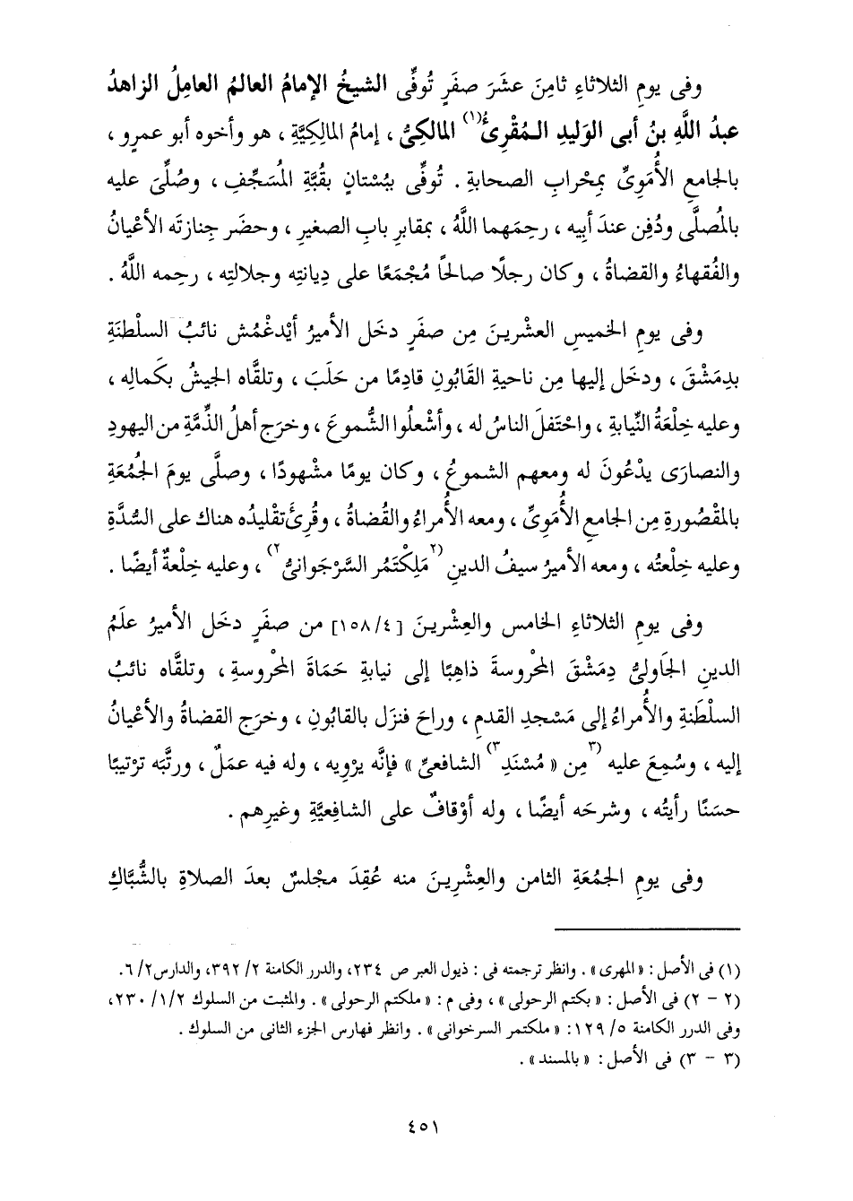 وَفِي يَوْمِ الثُّلَاثَاءِ ثَامِنَ عَشَرَ صَفَرٍ تُوُفِّيَ الشَّيْخُ الْإِمَامُ الْعَالِمُ الْعَامِلُ الزَّاهِدُ عَبْدُ اللَّهِ بْنُ أَبِي الْوَلِيدِ الْمُقْرِئُ الْمَالِكِيُّ، إِمَامُ الْمَالِكِيَّةِ، هُوَ وَأَخُوهُ أَبُو عَمْرٍو، بِالْجَامِعِ الْأُمَوِيِّ بِمِحْرَابِ الصَّحَابَةِ، تُوُفِّيَ بِبُسْتَانٍ بِقُبَّةِ الْمُسَجِّفِ، وَصُلِّيَ عَلَيْهِ بِالْمُصَلَّى، وَدُفِنَ عِنْدَ أَبِيهِ - رَحِمَهُمَا اللَّهُ - بِمَقَابِرِ بَابِ الصَّغِيرِ، وَحَضَرَ جَنَازَتَهُ الْأَعْيَانُ، وَالْفُقَهَاءُ، وَالْقُضَاةُ، وَكَانَ رَجُلًا صَالِحًا مُجْمَعًا عَلَى دِيَانَتِهِ وَجَلَالَتِهِ، رَحِمَهُ اللَّهُ.