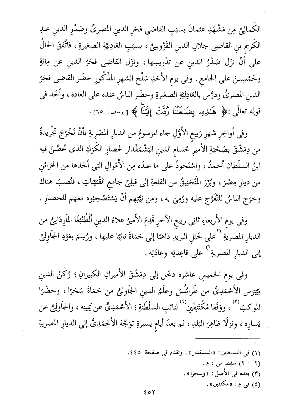 الْكَمَالِيِّ مِنْ مَشْهَدِ عُثْمَانَ بِسَبَبِ الْقَاضِي فَخْرِ الدِّينِ الْمِصْرِيِّ، وَصَدْرِ الدِّينِ عَبْدِ الْكَرِيِمِ ابْنِ الْقَاضِي جَلَالِ الدِّينِ الْقَزْوِينِيِّ; بِسَبَبِ الْعَادِلِيَّةِ الصَّغِيرَةِ، فَاتَّفَقَ الْحَالُ عَلَى أَنْ نَزَلَ صَدْرُ الدِّينِ عَنْ تَدْرِيسِهَا، وَنَزَلَ الْقَاضِي فَخْرُ الدِّينِ عَنْ مِائَةٍ وَخَمْسِينَ عَلَى الْجَامِعِ. وَفِي يَوْمِ الْأَحَدِ سَلْخِ الشَّهْرِ الْمَذْكُورِ حَضَرَ الْقَاضِي فَخْرُ الدِّينِ الْمِصْرِيُّ، وَدَرَّسَ بِالْعَادِلِيَّةِ الصَّغِيرَةِ، وَحَضَرَ النَّاسُ عِنْدَهُ عَلَى الْعَادَةِ، وَأَخَذَ فِي قَوْلِهِ تَعَالَى: {هَذِهِ بِضَاعَتُنَا رُدَّتْ إِلَيْنَا} [يوسف: 65] .