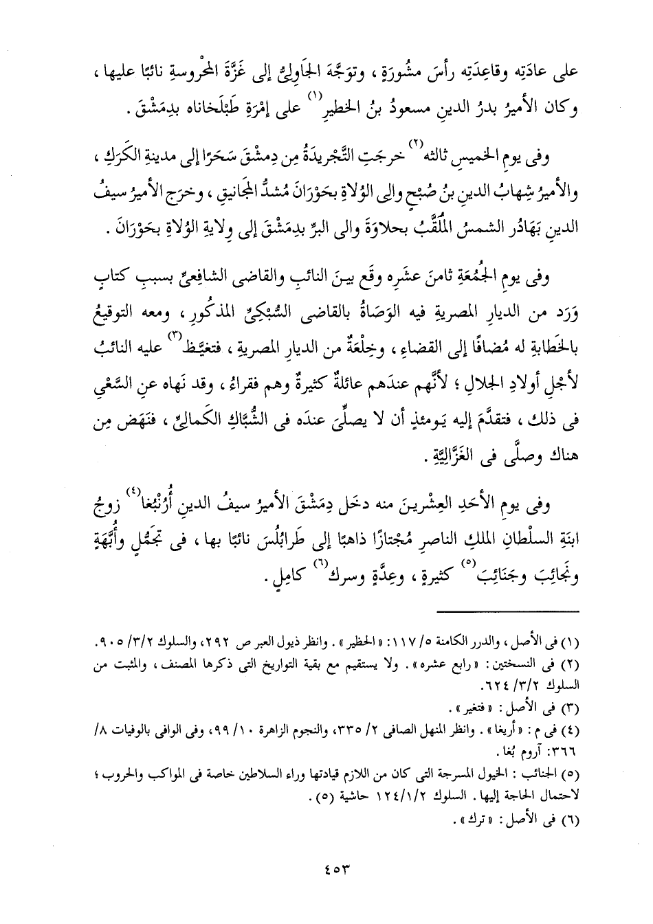 وَفِي يَوْمِ الْأَحَدِ الْعِشْرِينَ مِنْهُ دَخَلَ دِمَشْقَ الْأَمِيرُ سَيْفُ الدِّينِ أُرُنْبُغَا زَوْجُ ابْنَةِ السُّلْطَانِ الْمَلِكِ النَّاصِرِ مُجْتَازًا ذَاهِبًا إِلَى طَرَابُلُسَ نَائِبًا بِهَا - فِي تَجَمُّلٍ وَأُبَّهَةٍ، وَنَجَائِبَ وَجَنَائِبَ كَثِيرَةٍ، وَعِدَّةٍ وَسَرْكٍ كَامِلٍ.