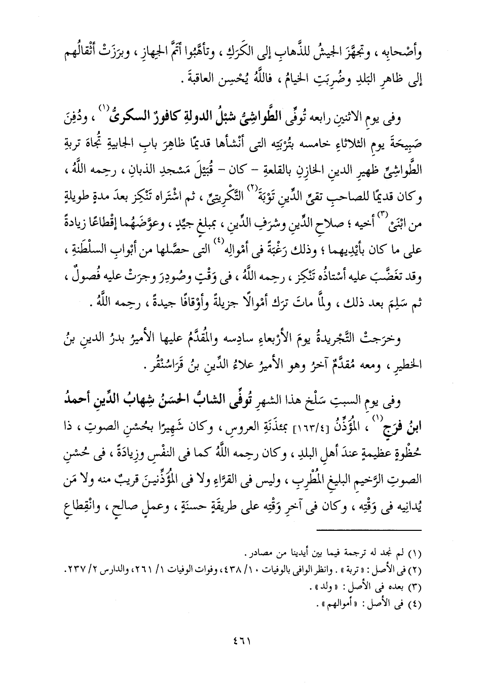 وَخَرَجَتِ التَّجْرِيدَةُ يَوْمَ الْأَرْبِعَاءِ سَادِسَهُ، وَالْمُقَدَّمُ عَلَيْهَا الْأَمِيرُ بَدْرُ الدِّينِ بْنُ الْخَطِيرِ، وَمَعَهُ مُقَدَّمٌ آخَرُ وَهُوَ الْأَمِيرُ عَلَاءُ الدِّينِ بْنُ قَرَاسُنْقُرَ.