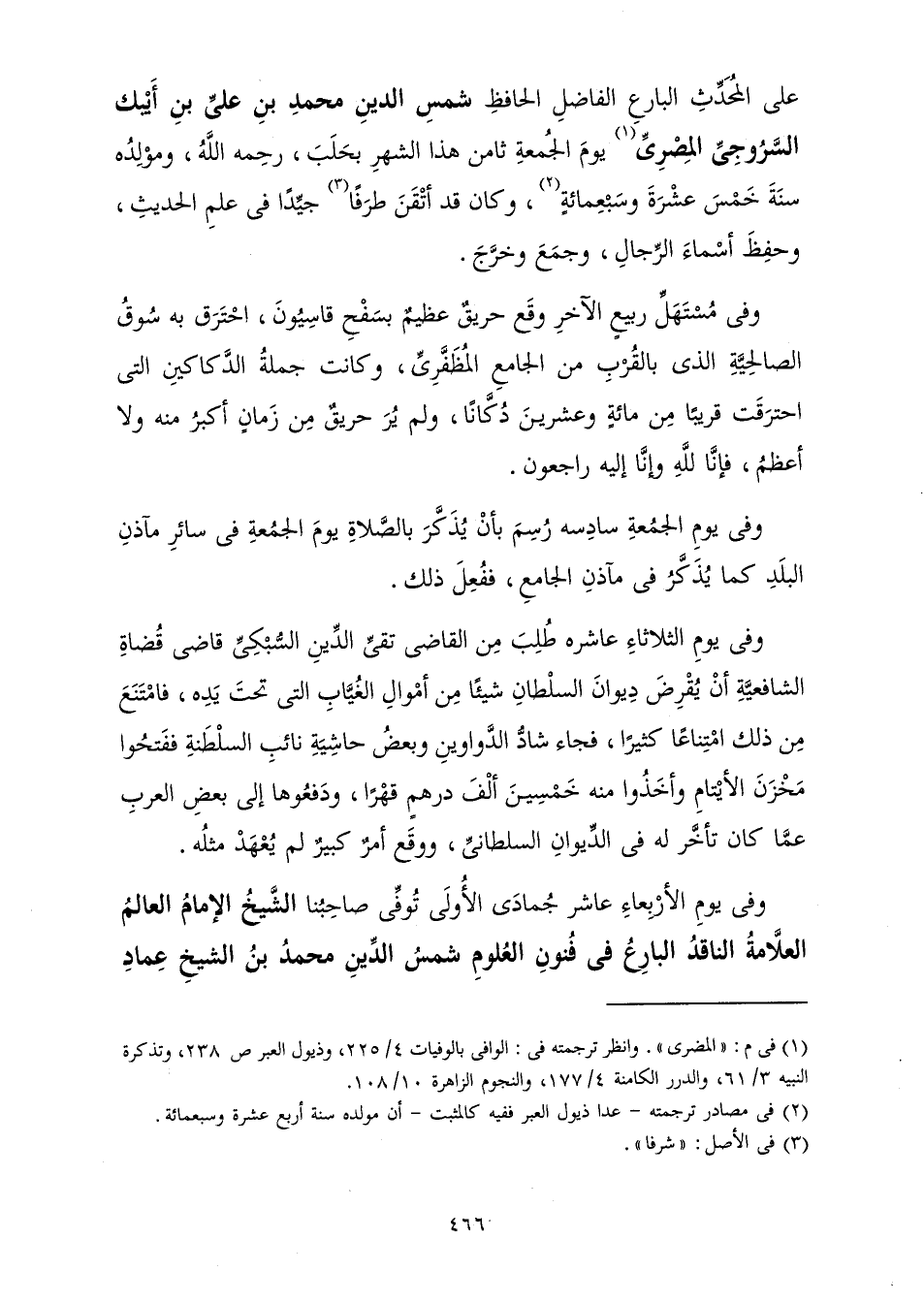 عَلَى الْمُحَدِّثِ الْبَارِعِ الْفَاضِلِ الْحَافِظِ شَمْسِ الدِّينِ مُحَمَّدِ بْنِ عَلِيِّ بْنِ أَيْبَكَ السَّرُوجِيِّ الْمِصْرِيِّ يَوْمَ الْجُمُعَةِ ثَامِنَ هَذَا الشَّهْرِ بِحَلَبَ، رَحِمَهُ اللَّهُ، وَمَوْلِدُهُ سَنَةَ خَمْسَ عَشْرَةَ وَسَبْعِمِائَةٍ، وَكَانَ قَدْ أَتْقَنَ طَرَفًا جَيِّدًا فِي عِلْمِ الْحَدِيثِ، وَحَفِظَ أَسْمَاءَ الرِّجَالِ، وَجَمَعَ وَخَرَّجَ.