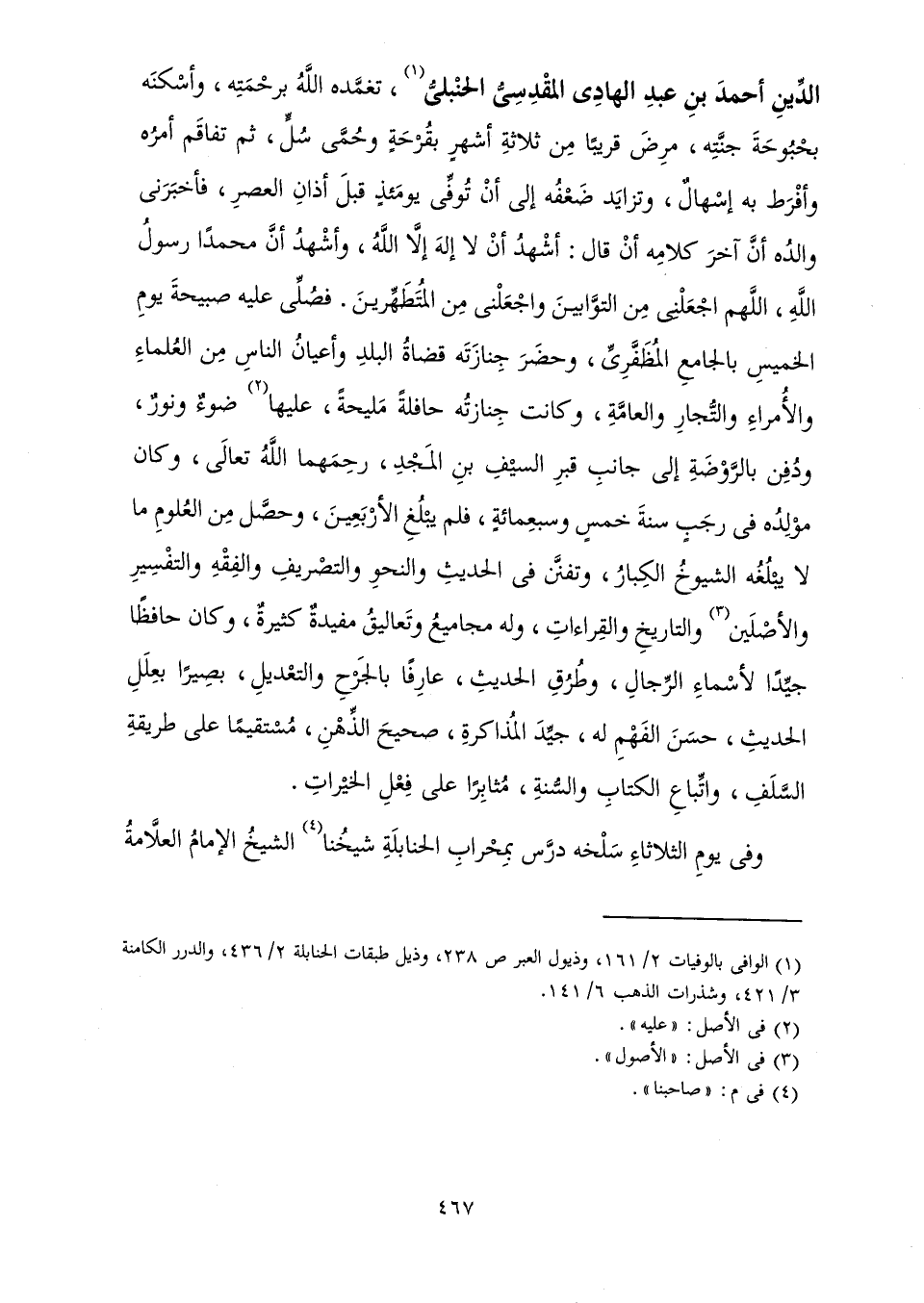 الدِّينِ أَحْمَدَ بْنِ عَبْدِ الْهَادِي الْمَقْدِسِيُّ الْحَنْبَلِيُّ، تَغَمَّدَهُ اللَّهُ بِرَحْمَتِهِ، وَأَسْكَنَهُ بُحْبُوحَةَ جَنَّتِهِ، مَرِضَ قَرِيبًا مِنْ ثَلَاثَةِ أَشْهُرٍ بِقُرْحَةٍ وَحُمَّى سُلٍّ، ثُمَّ تَفَاقَمَ أَمْرُهُ، وَأَفْرَطَ بِهِ إِسْهَالٌ، وَتَزَايَدَ ضَعْفُهُ إِلَى أَنْ تُوُفِّيَ يَوْمَئِذٍ قَبْلَ أَذَانِ الْعَصْرِ، فَأَخْبَرَنِي وَالِدُهُ أَنَّ آخِرَ كَلَامِهِ أَنْ قَالَ: أَشْهَدُ أَنْ لَا إِلَهَ إِلَّا اللَّهُ، وَأَشْهَدُ أَنَّ مُحَمَّدًا رَسُولُ اللَّهِ، اللَّهُمَّ اجْعَلْنِي مِنَ التَّوَّابِينَ، وَاجْعَلْنِي مِنَ الْمُتَطَهِّرِينَ، فَصُلِّيَ عَلَيْهِ صَبِيحَةَ يَوْمِ الْخَمِيسِ بِالْجَامِعِ الْمُظَفَّرِيِّ، وَحَضَرَ جَنَازَتَهُ قُضَاةُ الْبَلَدِ وَأَعْيَانُ النَّاسِ مِنَ الْعُلَمَاءِ، وَالْأُمَرَاءِ، وَالتُّجَّارِ، وَالْعَامَّةِ، وَكَانَتْ جَنَازَتُهُ حَافِلَةً مَلِيحَةً، عَلَيْهَا ضَوْءٌ وَنُورٌ، وَدُفِنَ بِالرَّوْضَةِ إِلَى جَانِبِ قَبْرِ السَّيْفِ بْنِ الْمَجْدِ، رَحِمَهُمَا اللَّهُ تَعَالَى، وَكَانَ مَوْلِدُهُ فِي رَجَبٍ سَنَةَ خَمْسٍ وَسَبْعِمِائَةٍ، فَلَمْ يَبْلُغِ الْأَرْبَعِينَ، وَحَصَّلَ مِنَ الْعُلُومِ مَا لَا يَبْلُغُهُ الشُّيُوخُ الْكِبَارُ، وَتَفَنَّنَ فِي الْحَدِيثِ، وَالنَّحْوِ، وَالتَّصْرِيفِ، وَالْفِقْهِ، وَالتَّفْسِيرِ، وَالْأَصْلَيْنِ، وَالتَّارِيخِ، وَالْقِرَاءَاتِ، وَلَهُ مَجَامِيعُ وَتَعَالِيقُ مُفِيدَةٌ كَثِيرَةٌ، وَكَانَ حَافِظًا جَيِّدًا لِأَسْمَاءِ الرِّجَالِ، وَطُرُقِ الْحَدِيثِ، عَارِفًا بِالْجَرْحِ وَالتَّعْدِيلِ، بَصِيرًا بِعِلَلِ الْحَدِيثِ، حَسَنَ الْفَهْمِ لَهُ، جَيِّدَ الْمُذَاكَرَةِ، صَحِيحَ الذِّهْنِ، مُسْتَقِيمًا عَلَى طَرِيقَةِ السَّلَفِ، وَاتِّبَاعِ الْكِتَابِ وَالسُّنَّةِ، مُثَابِرًا عَلَى فِعْلِ الْخَيِّرَاتِ.