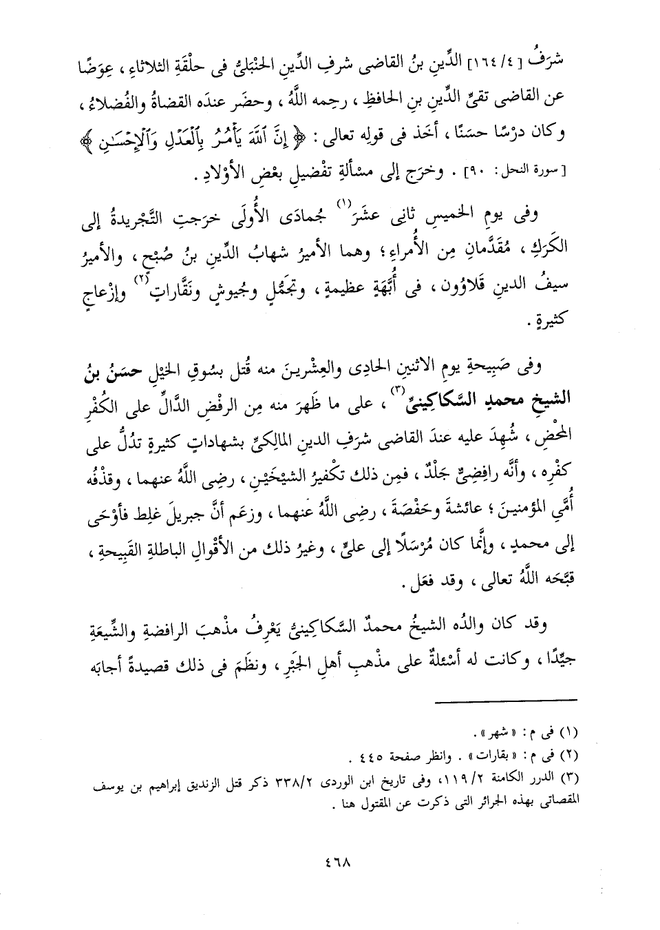 وَفِي صَبِيحَةِ يَوْمِ الِاثْنَيْنِ الْحَادِي وَالْعِشْرِينَ مِنْهُ قُتِلَ بِسُوقِ الْخَيْلِ حَسَنٌ ابْنُ الشَّيْخِ مُحَمَّدٍ السَّكَاكِينِيِّ، عَلَى مَا ظَهَرَ مِنْهُ مِنَ الرَّفْضِ الدَّالِّ عَلَى الْكُفْرِ الْمَحْضِ، شُهِدَ عَلَيْهِ عِنْدَ الْقَاضِي شَرَفِ الدِّينِ الْمَالِكِيِّ بِشَهَادَاتٍ كَثِيرَةٍ تَدُلُّ عَلَى كُفْرِهِ، وَأَنَّهُ رَافِضِيٌّ جَلْدٌ، فَمِنْ ذَلِكَ تَكْفِيرُ الشَّيْخَيْنِ - رَضِيَ اللَّهُ عَنْهُمَا - وَقَذْفُهُ أُمَّيِ الْمُؤْمِنِينَ; عَائِشَةَ وَحَفْصَةَ - رَضِيَ اللَّهُ عَنْهُمَا - وَزَعَمَ أَنَّ جِبْرِيلَ غَلِطَ فَأَوْحَى إِلَى مُحَمَّدٍ وَإِنَّمَا كَانَ مُرْسَلًا إِلَى عَلِيٍّ، وَغَيْرُ ذَلِكَ مِنَ الْأَقْوَالِ الْبَاطِلَةِ الْقَبِيحَةِ، قَبَّحَهُ اللَّهُ، وَقَدْ فَعَلَ.