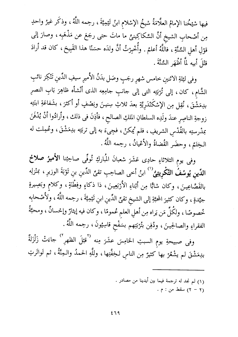 وَفِي يَوْمِ الثُّلَاثَاءِ حَادِيَ عَشَرَ شَعْبَانَ الْمُبَارَكِ تُوُفِّيَ صَاحِبُنَا الْأَمِيرُ صَلَاحُ الدِّينِ يُوسُفُ التِّكْرِيتِيُّ ابْنُ أَخِي الصَّاحِبِ تَقِيِّ الدِّينِ بْنِ تَوْبَةَ الْوَزِيرِ - بِمَنْزِلِهِ بِالْقَصَّاعِينَ - كَانَ شَابًّا مِنْ أَبْنَاءِ الْأَرْبَعِينَ، ذَا ذَكَاءٍ وَفِطْنَةٍ، وَكَلَامٍ وَبَصِيرَةٍ جَيِّدَةٍ، وَكَانَ كَثِيرَ الْمَحَبَّةِ إِلَى الشَّيْخِ تَقِيِّ الدِّينِ ابْنِ تَيْمِيَةَ - رَحِمَهُ اللَّهُ - وَلِأَصْحَابِهِ خُصُوصًا، وَلِكُلِّ مَنْ يَرَاهُ مِنْ أَهْلِ الْعِلْمِ عُمُومًا، وَكَانَ فِيهِ إِيثَارٌ وَإِحْسَانٌ، وَمَحَبَّةُ الْفُقَرَاءِ وَالصَّالِحِينَ، وَدُفِنَ بِتُرْبَتِهِمْ بِسَفْحِ قَاسِيُونَ، رَحِمَهُ اللَّهُ.