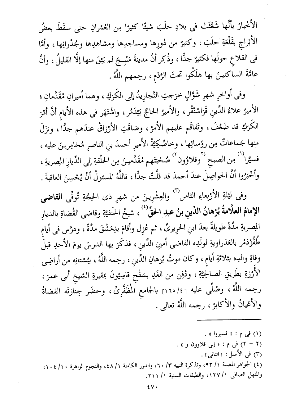 وَفِي لَيْلَةِ الْأَرْبِعَاءِ الثَّامِنِ وَالْعِشْرِينَ مِنْ شَهْرِ ذِي الْحِجَّةِ تُوُفِّيَ الْقَاضِي الْإِمَامُ الْعَلَّامَةُ بُرْهَانُ الدِّينِ بْنُ عَبْدِ الْحَقِّ، شَيْخُ الْحَنَفِيَّةِ، وَقَاضِي الْقُضَاةِ بِالدِّيَارِ الْمِصْرِيَّةِ مُدَّةً طَوِيلَةً - بَعْدَ ابْنِ الْحَرِيرِيِّ - ثُمَّ عُزِلَ، وَأَقَامَ بِدِمَشْقَ، وَدَرَّسَ فِي أَيَّامِ طُقُزْدَمُرَ بِالْعَذْرَاوِيَّةِ لِوَلَدِهِ الْقَاضِي أَمِينِ الدِّينِ، فَذَكَرَ بِهَا الدَّرْسَ يَوْمَ الْأَحَدِ قَبْلَ وَفَاةِ وَالِدِهِ بِثَلَاثَةِ أَيَّامٍ، وَكَانَ مَوْتُ بُرْهَانِ الدِّينِ - رَحِمَهُ اللَّهُ - بِبُسْتَانِهِ مِنْ أَرَاضِي الْأَرْزَةِ بِطَرِيقِ الصَّالِحِيَّةِ، وَدُفِنَ مِنَ الْغَدِ بِسَفْحِ قَاسِيُونَ بِمَقْبَرَةِ الشَّيْخِ أَبِي عُمَرَ - رَحِمَهُ اللَّهُ - وَصُلِّيَ عَلَيْهِ بِالْجَامِعِ الْمُظَفَّرِيِّ، وَحَضَرَ جَنَازَتَهُ الْقُضَاةُ، وَالْأَعْيَانُ، وَالْأَكَابِرُ. رَحِمَهُ اللَّهُ تَعَالَى.