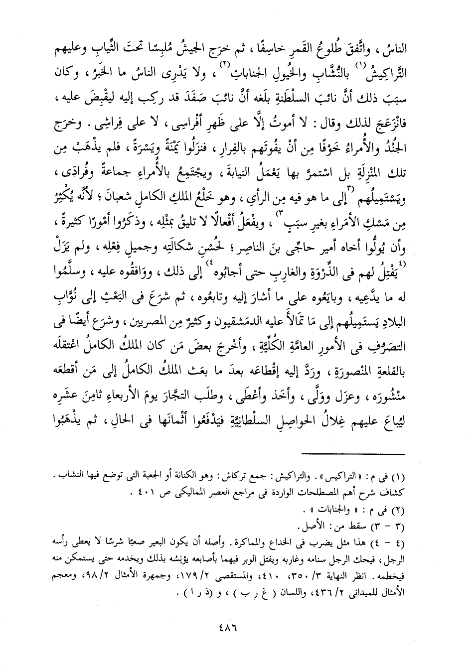 النَّاسُ، وَاتَّفَقَ طُلُوعُ الْقَمَرِ خَاسِفًا، ثُمَّ خَرَجَ الْجَيْشُ مُلْبِسًا تَحْتَ الثِّيَابِ، وَعَلَيْهِمُ التَّرَاكِيشُ بِالنُّشَّابِ وَالْخُيُولِ الْجَنَابَاتِ، وَلَا يَدْرِي النَّاسُ مَا الْخَبَرُ، وَكَانَ سَبَبُ ذَلِكَ أَنَّ نَائِبَ السَّلْطَنَةِ بَلَغَهُ أَنَّ نَائِبَ صَفَدَ قَدْ رَكِبَ إِلَيْهِ لِيَقْبِضَ عَلَيْهِ، فَانْزَعَجَ لِذَلِكَ، وَقَالَ: لَا أَمُوتُ إِلَّا عَلَى ظَهْرِ أَفْرَاسِي، لَا عَلَى فِرَاشِي. وَخَرَجَ الْجُنْدُ وَالْأُمَرَاءُ خَوْفًا مِنْ أَنْ يَفُوتَهُمْ بِالْفِرَارِ، فَنَزَلُوا يَمْنَةً وَيَسْرَةً، فَلَمْ يَذْهَبْ مِنْ تِلْكَ الْمَنْزِلَةِ بَلِ اسْتَمَرَّ بِهَا يَعْمَلُ النِّيَابَةَ، وَيَجْتَمِعُ بِالْأُمَرَاءِ جَمَاعَةً وَفُرَادَى، وَيَسْتَمِيلُهُمْ إِلَى مَا هُوَ فِيهِ مِنَ الرَّأْيِ، وَهُوَ خَلْعُ الْمَلِكِ الْكَامِلِ شَعْبَانَ ; لِأَنَّهُ يُكْثِرُ مِنْ مَسْكِ الْأُمَرَاءِ بِغَيْرِ سَبَبٍ، وَيَفْعَلُ أَفْعَالًا لَا تَلِيقُ بِمِثْلِهِ، وَذَكَرُوا أُمُورًا كَثِيرَةً، وَأَنْ يُوَلُّوا أَخَاهُ أَمِيرَ حَاجِّي بْنَ النَّاصِرِ; لِحُسْنِ شَكَالَتِهِ، وَجَمِيلِ فِعْلِهِ، وَلَمْ يَزَلْ يَفْتِلُ لَهُمْ فِي الذِّرْوَةِ وَالْغَارِبِ حَتَّى أَجَابُوهُ إِلَى ذَلِكَ، وَوَافَقُوهُ عَلَيْهِ، وَسَلَّمُوا لَهُ مَا يَدَّعِيهِ، وَبَايَعُوهُ عَلَى مَا أَشَارَ إِلَيْهِ وَتَابَعُوهُ، ثُمَّ شَرَعَ فِي الْبَعْثِ إِلَى نُوَّابِ الْبِلَادِ يَسْتَمِيلُهُمْ إِلَى مَا تَمَالَأَ عَلَيْهِ الدِّمَشْقِيُّونَ وَكَثِيرٌ مِنَ الْمِصْرِيِّينَ، وَشَرَعَ أَيْضًا فِي التَّصَرُّفِ فِي الْأُمُورِ الْعَامَّةِ الْكُلِّيَّةِ، وَأَخْرَجَ بَعْضَ مَنْ كَانَ الْمَلَكُ الْكَامِلُ اعْتَقَلَهُ بِالْقَلْعَةِ الْمَنْصُورَةِ، وَرَدَّ إِلَيْهِ إِقْطَاعَهُ بَعْدَ مَا بَعَثَ الْمَلِكُ الْكَامِلُ إِلَى مَنْ أَقْطَعَهُ مَنْشُورَهُ، وَعَزَلَ وَوَلَّى، وَأَخَذَ وَأَعْطَى، وَطَلَبَ التُّجَّارَ يَوْمَ الْأَرْبِعَاءِ ثَامِنَ عَشَرَهُ لِيُبَاعَ عَلَيْهِمْ غِلَالُ الْحَوَاصِلِ السُّلْطَانِيَّةِ، فَيَدْفَعُوا أَثْمَانَهَا فِي الْحَالِ، ثُمَّ يَذْهَبُوا