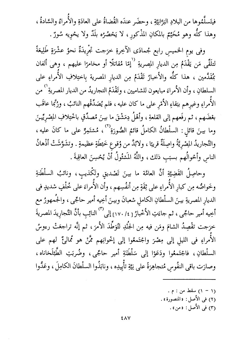 وَحَاصِلُ الْقَضِيَّةِ أَنَّ الْعَامَّةَ مَا بَيْنَ تَصْدِيقٍ وَتَكْذِيبٍ، وَنَائِبُ السَّلْطَنَةِ وَخَوَاصُّهُ مِنْ كِبَارِ الْأُمَرَاءِ عَلَى ثِقَةٍ مِنْ أَنْفُسِهِمْ، وَأَنَّ الْأُمَرَاءَ عَلَى خُلْفٍ شَدِيدٍ فِي الدِّيَارِ الْمِصْرِيَّةِ بَيْنَ السُّلْطَانِ الْكَامِلِ شَعْبَانَ وَبَيْنَ أَخِيهِ أَمِيرِ حَاجِّي، وَالْجُمْهُورُ مَعَ أَخِيهِ أَمِيرِ حَاجِّي، ثُمَّ جَاءَتِ الْأَخْبَارُ إِلَى النَّائِبِ بِأَنَّ التَّجَارِيدَ الْمِصْرِيَّةَ خَرَجَتْ تَقْصِدُ الشَّامَ وَمَنْ فِيهِ مِنَ الْجُنْدِ لِتُوَطِّدَ الْأَمْرَ، ثُمَّ إِنَّهُ تَرَاجَعَتْ رُءُوسُ الْأُمَرَاءِ فِي اللَّيْلِ إِلَى مِصْرَ، وَاجْتَمَعُوا إِلَى إِخْوَانِهِمْ مِمَّنْ هُوَ مُمَالِئٌ لَهُمْ عَلَى السُّلْطَانِ، فَاجْتَمَعُوا وَدَعَوْا إِلَى سَلْطَنَةِ أَمِيرِ حَاجِّي، وَضُرِبَتِ الطَّبْلَخَانَاهْ، وَصَارَتْ بَاقِي النُّفُوسِ مُتَجَاهِرَةً عَلَى نِيَّةِ تَأْيِيدِهِ، وَنَابَذُوا السُّلْطَانَ الْكَامِلَ، وَعَدُّوا