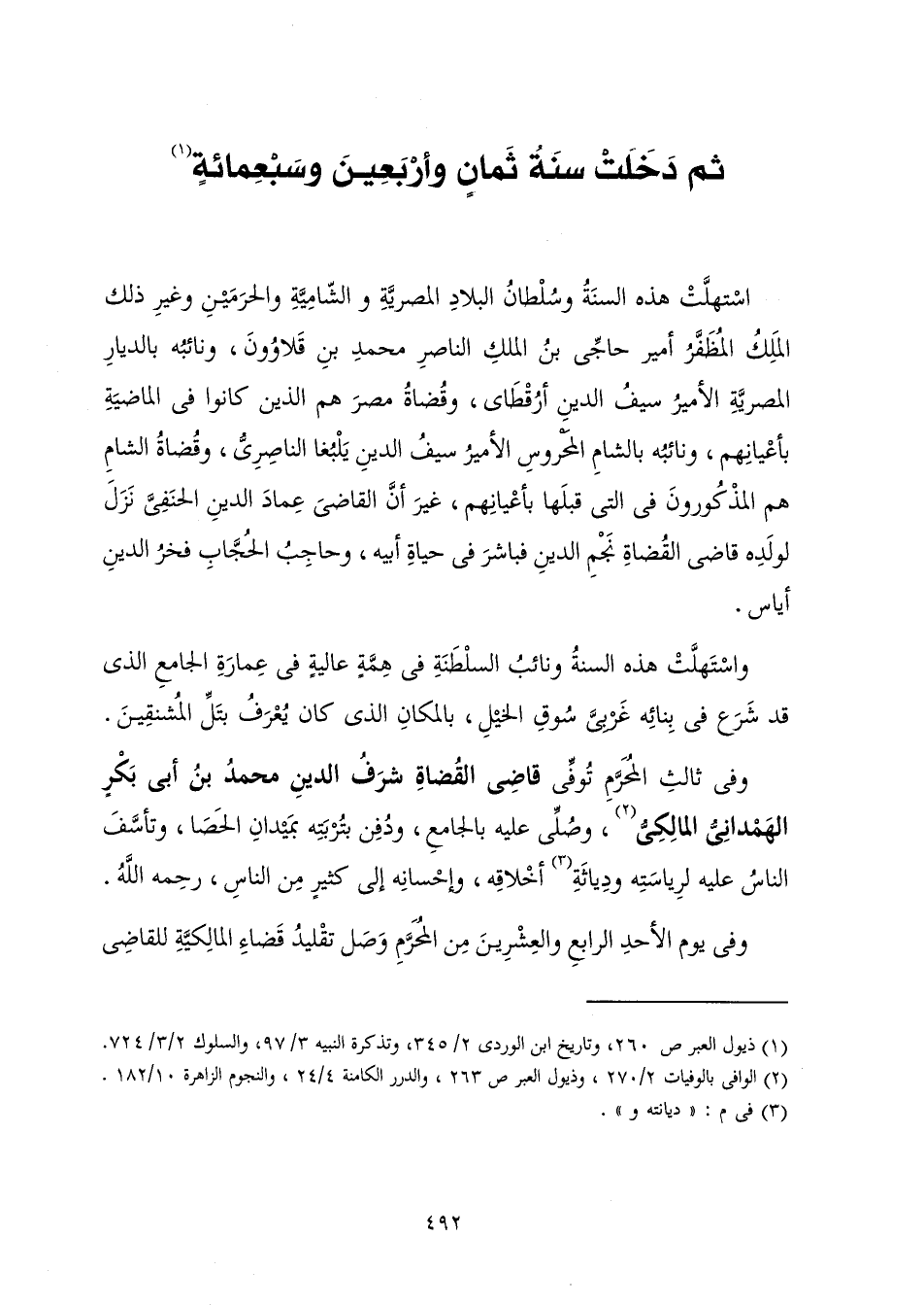 وَفِي ثَالِثِ الْمُحَرَّمِ تُوُفِّيَ قَاضِي الْقُضَاةِ شَرَفُ الدِّينِ مُحَمَّدُ بْنُ أَبِي بَكْرٍ الْهَمْدَانِيُّ الْمَالِكِيُّ، وَصُلِّيَ عَلَيْهِ بِالْجَامِعِ، وَدُفِنَ بِتُرْبَتِهِ بِمَيْدَانِ الْحَصَا، وَتَأَسَّفَ النَّاسُ عَلَيْهِ لِرِيَاسَتِهِ وَدِيَاثَةِ أَخْلَاقِهِ، وَإِحْسَانِهِ إِلَى كَثِيرٍ مِنَ النَّاسِ، رَحِمَهُ اللَّهُ.