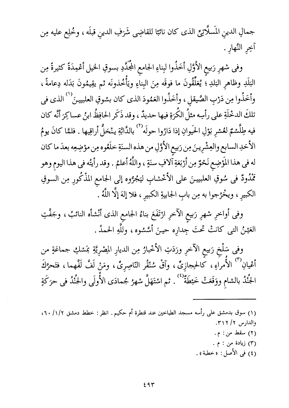وَفِي شَهْرِ رَبِيعٍ الْأَوَّلِ أَخَذُوا لِبِنَاءِ الْجَامِعِ الْمُجَدَّدِ بِسُوقِ الْخَيْلِ أَعْمِدَةً كَثِيرَةً مِنَ الْبَلَدِ وَظَاهِرِ الْبَلَدِ، يُعَلِّقُونَ مَا فَوْقَهُ مِنَ الْبِنَاءِ وَيَأْخُذُونَهُ ثُمَّ يُقِيمُونَ بَدَلَهُ دِعَامَةً، وَأَخَذُوا مِنْ دَرْبِ الصَّيْقَلِ، وَأَخَذُوا الْعَمُودَ الَّذِي كَانَ بِسُوقِ الْعِلْبِيِّينَ الَّذِي فِي تِلْكَ الدَّخْلَةِ عَلَى رَأْسِهِ مِثْلُ الْكُرَةِ فِيهَا حَدِيدٌ، وَقَدْ ذَكَرَ الْحَافِظُ ابْنُ عَسَاكِرَ أَنَّهُ كَانَ فِيهِ طَلْسَمٌ لِعُسْرِ بَوْلِ الْحَيَوَانِ إِذَا دَارُوا حَوْلَهُ بِالدَّابَّةِ يَنْحَلُّ أَرَاقِيهَا. فَلَمَّا كَانَ يَوْمُ الْأَحَدِ السَّابِعِ وَالْعِشْرِينَ مِنْ رَبِيعٍ الْأَوَّلِ مِنْ هَذِهِ السَّنَةِ خَلَعُوهُ مِنْ مَوْضِعِهِ، بَعْدَ مَا كَانَ لَهُ فِي هَذَا الْمَوْضِعِ نَحْوًا مِنْ أَرْبَعَةِ آلَافِ سَنَةٍ، وَاللَّهُ أَعْلَمُ. وَقَدْ رَأَيْتُهُ فِي هَذَا الْيَوْمِ وَهُوَ مَمْدُودٌ فِي سُوقِ الْعِلْبِيِّينَ عَلَى الْأَخْشَابِ لِيَجُرُّوهُ إِلَى الْجَامِعِ الْمَذْكُورِ مِنَ السُّوقِ الْكَبِيرِ، وَيَخْرُجُوا بِهِ مِنْ بَابِ الْجَابِيَةِ الْكَبِيرِ، فَلَا إِلَهَ إِلَّا اللَّهُ.