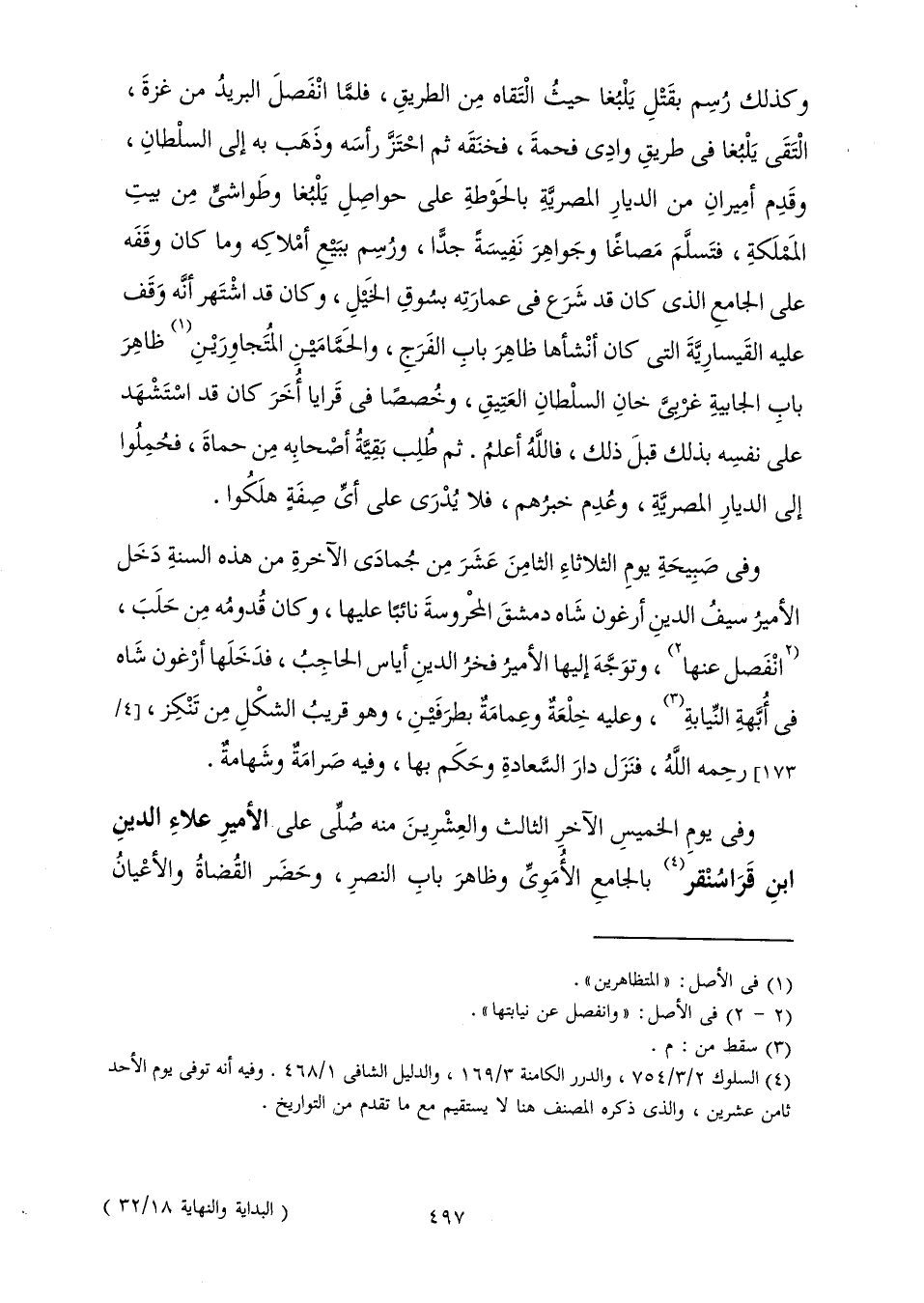 وَفِي يَوْمِ الْخَمِيسِ الْآخِرِ الثَّالِثِ وَالْعِشْرِينَ مِنْهُ صُلِّيَ عَلَى الْأَمِيرِ عَلَاءِ الدِّينِ بْنِ قَرَاسُنْقُرَ بِالْجَامِعِ الْأُمَوِيِّ وَظَاهِرَ بَابِ النَّصْرِ، وَحَضَرَ الْقُضَاةُ، وَالْأَعْيَانُ،