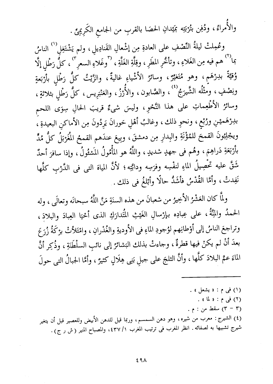 وَعُمِلَتْ لَيْلَةُ النِّصْفِ عَلَى الْعَادَةِ مِنْ إِشْعَالِ الْقَنَادِيلِ، وَلَمْ يَشْتَغِلِ النَّاسُ بِمَا هُمْ فِيهِ مِنَ الْغَلَاءِ، وَتَأَخُّرِ الْمَطَرِ، وَقِلَّةِ الْغَلَّةِ، وَغَلَاءِ السِّعْرِ، كُلُّ رَطْلٍ إِلَّا وُقِيَّةً بِدِرْهَمٍ، وَهُوَ مُتَغَيِّرٌ، وَسَائِرُ الْأَشْيَاءِ غَالِيَةٌ، وَالزَّيْتُ كُلُّ رَطْلٍ بِأَرْبَعَةٍ وَنِصْفٍ، وَمَثْلُهُ الشَّيْرَجُ، وَالصَّابُونُ، وَالْأُرْزُ، وَالْعَنْبَرِيسُ، كُلُّ رَطْلٍ بِثَلَاثَةٍ، وَسَائِرُ الْأَطْعِمَاتِ عَلَى هَذَا النَّحْوِ، وَلَيْسَ شَيْءٌ قَرِيبَ الْحَالِ سِوَى اللَّحْمِ بِدِرْهَمَيْنِ وَرُبْعٍ، وَنَحْوِ ذَلِكَ، وَغَالِبُ أَهْلِ حَوْرَانَ يَرِدُونَ مِنَ الْأَمَاكِنِ الْبَعِيدَةِ، وَيَجْلِبُونَ الْقَمْحَ لِلْمُؤْنَةِ وَالْبِدَارِ مِنْ دِمَشْقَ، وَبِيعَ عِنْدَهُمُ الْقَمْحُ الْمُغَرْبَلُ كُلُّ مُدٍّ بِأَرْبَعَةِ دَرَاهِمَ، وَهُمْ فِي جَهْدٍ شَدِيدٍ، وَاللَّهُ هُوَ الْمَأْمُولُ الْمَسْئُولُ، وَإِذَا سَافَرَ أَحَدٌ شَقَّ عَلَيْهِ تَحْصِيلُ الْمَاءِ لِنَفْسِهِ وَلِفَرَسِهِ وَدَابَّتِهِ; لِأَنَّ الْمِيَاهَ الَّتِي فِي الدَّرْبِ كُلَّهَا نَفِدَتْ، وَأَمَّا الْقُدْسُ فَأَشَدُّ حَالًا وَأَبْلَغُ فِي ذَلِكَ.