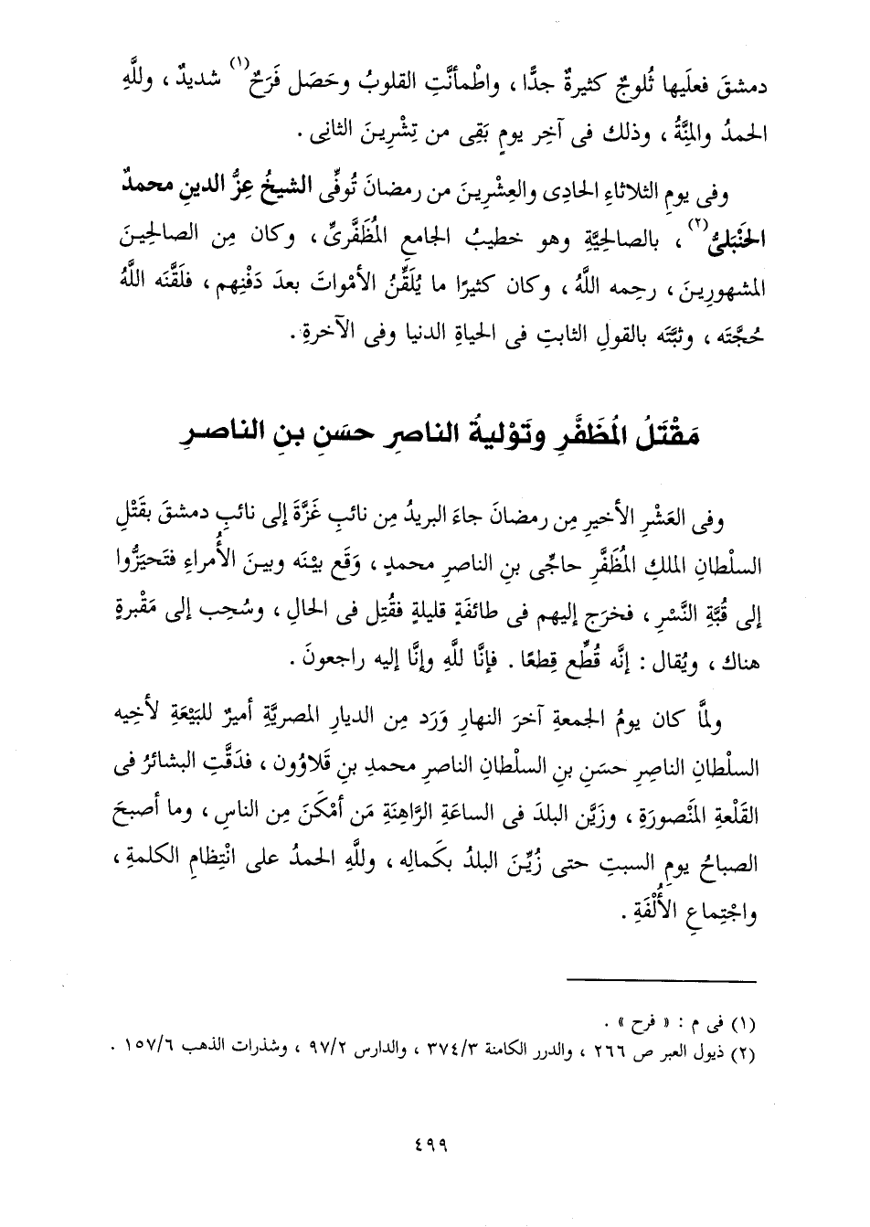 وَلَمَّا كَانَ يَوْمُ الْجُمُعَةِ آخِرَ النَّهَارِ وَرَدَ مِنَ الدِّيَارِ الْمِصْرِيَّةِ أَمِيرٌ لِلْبَيْعَةِ لِأَخِيهِ السُّلْطَانِ النَّاصِرِ حَسَنٍ ابْنِ السُّلْطَانِ النَّاصِرِ مُحَمَّدِ بْنِ قَلَاوُونَ، فَدَقَّتِ الْبَشَائِرُ فِي الْقَلْعَةِ الْمَنْصُورَةِ، وَزَيَّنَ الْبَلَدَ فِي السَّاعَةِ الرَّاهِنَةِ مَنْ أَمْكَنَ مِنَ النَّاسِ، وَمَا أَصْبَحَ الصَّبَاحُ يَوْمَ السَّبْتِ حَتَّى زُيِّنَ الْبَلَدُ بِكَمَالِهِ، وَلِلَّهِ الْحَمْدُ عَلَى انْتِظَامِ الْكَلِمَةِ، وَاجْتِمَاعِ الْأُلْفَةِ.