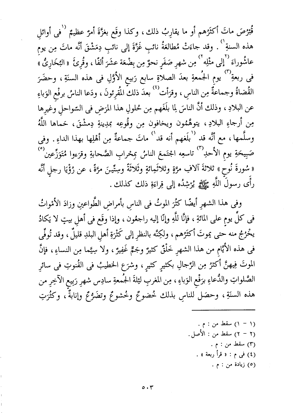 وَفِي هَذَا الشَّهْرِ أَيْضًا كَثُرَ الْمَوْتُ فِي النَّاسِ بِأَمْرَاضِ الطَّوَاعِينِ، وَزَادَ الْأَمْوَاتُ فِي كُلِّ يَوْمٍ عَلَى الْمِائَةِ، فَإِنَّا لِلَّهِ وَإِنَّا إِلَيْهِ رَاجِعُونَ، وَإِذَا وَقَعَ فِي أَهْلِ بَيْتٍ لَا يَكَادُ يَخْرُجُ مِنْهُ حَتَّى يَمُوتَ أَكْثَرُهُمْ، وَلَكِنَّهُ بِالنَّظَرِ إِلَى كَثْرَةِ أَهْلِ الْبَلَدِ قَلِيلٌ، وَقَدْ تُوُفِّيَ فِي هَذِهِ الْأَيَّامِ مِنْ هَذَا الشَّهْرِ خَلْقٌ كَثِيرٌ، وَجَمٌّ غَفِيرٌ، وَلَا سِيَّمَا مِنَ النِّسَاءِ فَإِنَّ الْمَوْتَ فِيهِنَّ أَكْثَرُ مِنَ الرِّجَالِ بِكَثِيرٍ كَثِيرٍ، وَشَرَعَ الْخَطِيبُ فِي الْقُنُوتِ فِي سَائِرِ الصَّلَوَاتِ، وَالدُّعَاءِ بِرَفْعِ الْوَبَاءِ مِنَ الْمَغْرِبِ لَيْلَةَ الْجُمُعَةِ سَادِسَ شَهْرِ رَبِيعٍ الْآخِرِ مِنْ هَذِهِ السَّنَةِ، وَحَصَلَ لِلنَّاسِ بِذَلِكَ خُضُوعٌ، وَخُشُوعٌ، وَتَضَرُّعٌ، وَإِنَابَةٌ، وَكَثُرَتِ