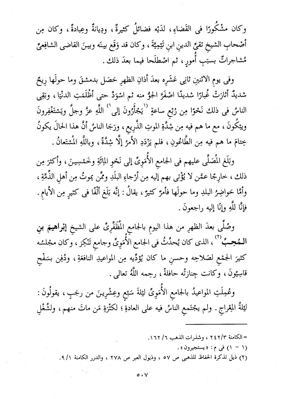 وَبَلَغَ الْمُصَلَّى عَلَيْهِمْ فِي الْجَامِعِ الْأُمَوِيِّ إِلَى نَحْوِ الْمِائَةِ وَخَمْسِينَ، وَأَكْثَرَ مِنْ ذَلِكَ، خَارِجًا عَمَّنْ لَا يُؤْتَى بِهِمْ إِلَيْهِ مِنْ أَرْجَاءِ الْبَلَدِ وَمِمَّنْ يَمُوتُ مِنْ أَهْلِ الذِّمَّةِ، وَأَمَّا حَوَاضِرُ الْبَلَدِ وَمَا حَوْلَهَا فَأَمْرٌ كَثِيرٌ، يُقَالُ: إِنَّهُ بَلَغَ أَلْفًا فِي كَثِيرٍ مِنَ الْأَيَّامِ، فَإِنَّا لِلَّهِ وَإِنَّا إِلَيْهِ رَاجِعُونَ. وَصَلَّى بَعْدَ الظُّهْرِ مِنْ هَذَا الْيَوْمِ بِالْجَامِعِ الْمُظَفَّرِيِّ عَلَى الشَّيْخِ إِبْرَاهِيمِ بْنِ الْمُحِبِّ، الَّذِي كَانَ يُحَدِّثُ فِي الْجَامِعِ الْأُمَوِيِّ وَجَامِعِ تَنْكِزَ، وَكَانَ مَجْلِسُهُ كَثِيرَ الْجَمْعِ; لِصَلَاحِهِ، وَحُسْنِ مَا كَانَ يُؤَدِّيهِ مِنَ الْمَوَاعِيدِ النَّافِعَةِ، وَدُفِنَ بِسَفْحِ قَاسِيُونَ، وَكَانَتْ جَنَازَتُهُ حَافِلَةً، رَحِمَهُ اللَّهُ تَعَالَى.