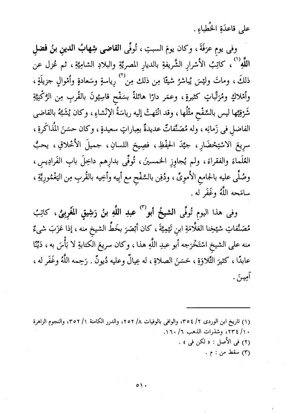 وَفِي يَوْمِ عَرَفَةَ - وَكَانَ يَوْمَ السَّبْتِ - تُوُفِّيَ الْقَاضِي شِهَابُ الدِّينِ بْنُ فَضْلِ اللَّهِ، كَاتِبُ الْأَسْرَارِ الشَّرِيفَةِ بِالدِّيَارِ الْمِصْرِيَّةِ وَالْبِلَادِ الشَّامِيَّةِ، ثُمَّ عُزِلَ عَنْ ذَلِكَ، وَمَاتَ، وَلَيْسَ يُبَاشِرُ شَيْئًا مِنْ ذَلِكَ مِنْ رِيَاسَةٍ، وَسَعَادَةٍ، وَأَمْوَالٍ جَزِيلَةٍ، وَأَمْلَاكٍ، وَمُرَتَّبَاتٍ كَثِيرَةٍ، وَعَمَرَ دَارًا هَائِلَةً بِسَفْحِ قَاسِيُونَ بِالْقُرْبِ مِنَ الرُّكْنِيَّةِ شَرْقِيَّهَا، لَيْسَ بِالسَّفْحِ مِثْلُهَا، وَقَدِ انْتَهَتْ إِلَيْهِ رِيَاسَةُ الْإِنْشَاءِ، وَكَانَ يُشَبَّهُ بِالْقَاضِي الْفَاضِلِ فِي زَمَانِهِ، وَلَهُ مُصَنَّفَاتٌ عَدِيدَةٌ بِعِبَارَاتٍ سَعِيدَةٍ، وَكَانَ حَسَنَ الْمُذَاكَرَةِ، سَرِيعَ الِاسْتِحْضَارِ، جَيِّدَ الْحِفْظِ، فَصِيحَ اللِّسَانِ، جَمِيلَ الْأَخْلَاقِ، يُحِبُّ الْعُلَمَاءَ وَالْفُقَرَاءَ، وَلَمْ يُجَاوِزِ الْخَمْسِينَ، تُوفِي بِدَارِهِمْ دَاخِلَ بَابِ الْفَرَادِيسِ، وَصُلِّيَ عَلَيْهِ بِالْجَامِعِ الْأُمَوِيِّ، وَدُفِنَ بِالسَّفْحِ مَعَ أَبِيهِ وَأَخِيهِ بِالْقُرْبِ مِنَ الْيَغْمُورِيَّةِ سَامَحَهُ اللَّهُ، وَغَفَرَ لَهُ.