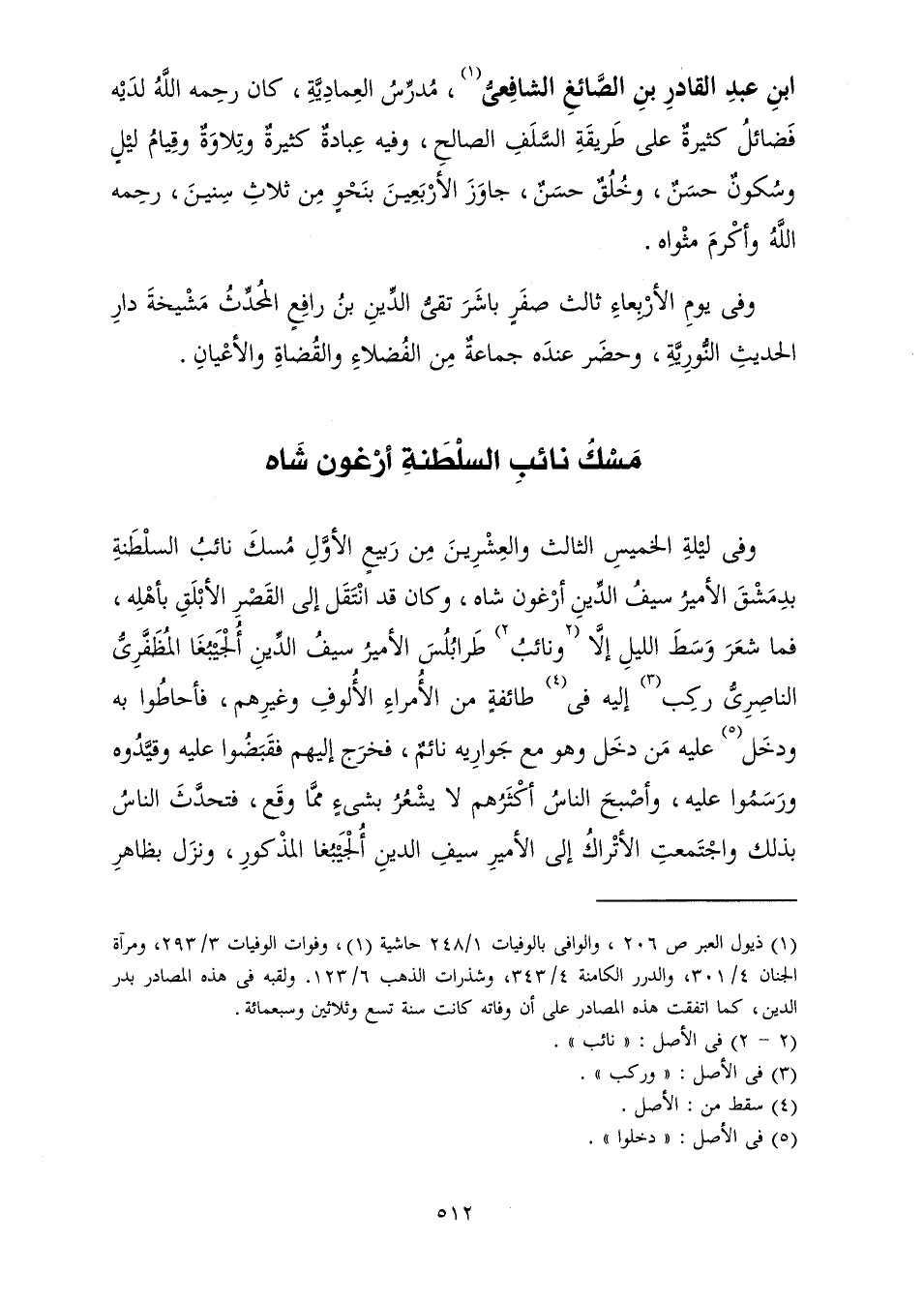 وَفِي لَيْلَةِ الْخَمِيسِ الثَّالِثِ وَالْعِشْرِينَ مِنْ رَبِيعٍ الْأَوَّلِ مُسِكَ نَائِبُ السَّلْطَنَةِ بِدِمَشْقَ الْأَمِيرُ سَيْفُ الدِّينِ أَرْغُونُ شَاهْ، وَكَانَ قَدِ انْتَقَلَ إِلَى الْقَصْرِ الْأَبْلَقِ بِأَهْلِهِ، فَمَا شَعَرَ وَسَطَ اللَّيْلِ إِلَّا وَنَائِبُ طَرَابُلُسَ الْأَمِيرُ سَيْفُ الدِّينِ أُلْجَيْبُغَا الْمُظَفَّرِيُّ النَّاصِرِيُّ رَكِبَ إِلَيْهِ فِي طَائِفَةٍ مِنَ الْأُمَرَاءِ الْأُلُوفِ وَغَيْرِهِمْ، فَأَحَاطُوا بِهِ، وَدَخَلَ عَلَيْهِ مَنْ دَخَلَ وَهُوَ مَعَ جَوَارِيهِ نَائِمٌ، فَخَرَجَ إِلَيْهِمْ، فَقَبَضُوا عَلَيْهِ وَقَيَّدُوهُ، وَرَسَمُوا عَلَيْهِ، وَأَصْبَحَ النَّاسُ أَكْثَرُهُمْ لَا يَشْعُرُ بِشَيْءٍ مِمَّا وَقَعَ، فَتَحَدَّثَ النَّاسُ بِذَلِكَ، وَاجْتَمَعَتِ الْأَتْرَاكُ إِلَى الْأَمِيرِ سَيْفِ الدِّينِ أُلْجَيْبُغَا الْمَذْكُورِ، وَنَزَلَ بِظَاهِرِ