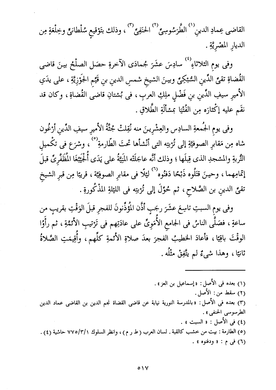 وَفِي يَوْمِ الثُّلَاثَاءِ سَادِسَ عَشَرَ جُمَادَى الْآخِرَةِ حَصَلَ الصُّلْحُ بَيْنَ قَاضِي الْقُضَاةِ تَقِيِّ الدِّينِ السُّبْكِيِّ، وَبَيْنَ الشَّيْخِ شَمْسِ الدِّينِ بْنِ قَيِّمِ الْجَوْزِيَّةِ، عَلَى يَدَيِ الْأَمِيرِ سَيْفِ الدِّينِ بْنِ فَضْلٍ مَلِكِ الْعَرَبِ، فِي بُسْتَانِ قَاضِي الْقُضَاةِ، وَكَانَ قَدْ نَقَمَ عَلَيْهِ إِكْثَارَهُ مِنَ الْفُتْيَا بِمَسْأَلَةِ الطَّلَاقِ.