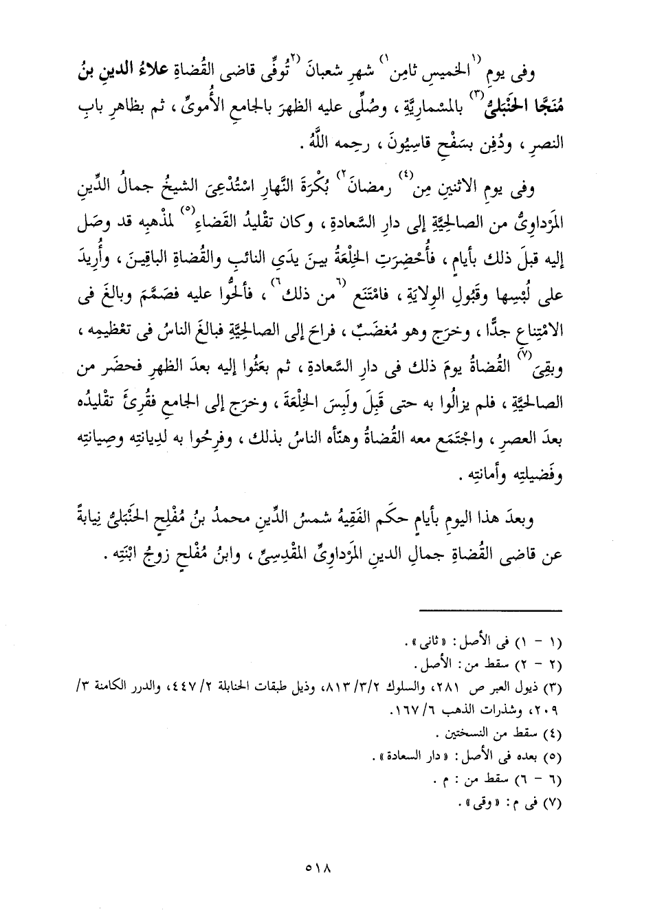 وَفِي يَوْمِ الِاثْنَيْنِ مِنْ رَمَضَانَ بُكْرَةَ النَّهَارِ اسْتُدْعِيَ الشَّيْخُ جَمَالُ الدِّينِ الْمَرْدَاوِيُّ مِنَ الصَّالِحِيَّةِ إِلَى دَارِ السَّعَادَةِ، وَكَانَ تَقْلِيدُ الْقَضَاءِ لِمَذْهَبِهِ قَدْ وَصَلَ إِلَيْهِ قَبْلَ ذَلِكَ بِأَيَّامٍ، فَأُحْضِرَتِ الْخِلْعَةُ بَيْنَ يَدَيِ النَّائِبِ وَالْقُضَاةِ الْبَاقِينَ، وَأُرِيدَ عَلَى لُبْسِهَا وَقَبُولِ الْوِلَايَةِ، فَامْتَنَعَ مِنْ ذَلِكَ، فَأَلَحُّوا عَلَيْهِ فَصَمَّمَ، وَبَالَغَ فِي الِامْتِنَاعِ جِدًّا، وَخَرَجَ وَهُوَ مُغْضَبٌ، فَرَاحَ إِلَى الصَّالِحِيَّةِ فَبَالَغَ النَّاسُ فِي تَعْظِيمِهِ، وَبَقِيَ الْقُضَاةُ يَوْمَ ذَلِكَ فِي دَارِ السَّعَادَةِ، ثُمَّ بَعَثُوا إِلَيْهِ بَعْدَ الظُّهْرِ فَحَضَرَ مِنَ الصَّالِحِيَّةِ، فَلَمْ يَزَالُوا بِهِ حَتَّى قَبِلَ وَلَبِسَ الْخِلْعَةَ، وَخَرَجَ إِلَى الْجَامِعِ فَقُرِئَ تَقْلِيدُهُ بَعْدَ الْعَصْرِ، وَاجْتَمَعَ مَعَهُ الْقُضَاةُ وَهَنَّأَهُ النَّاسُ بِذَلِكَ، وَفَرِحُوا بِهِ; لِدِيَانَتِهِ، وَصِيَانَتِهِ، وَفَضِيلَتِهِ، وَأَمَانَتِهِ.