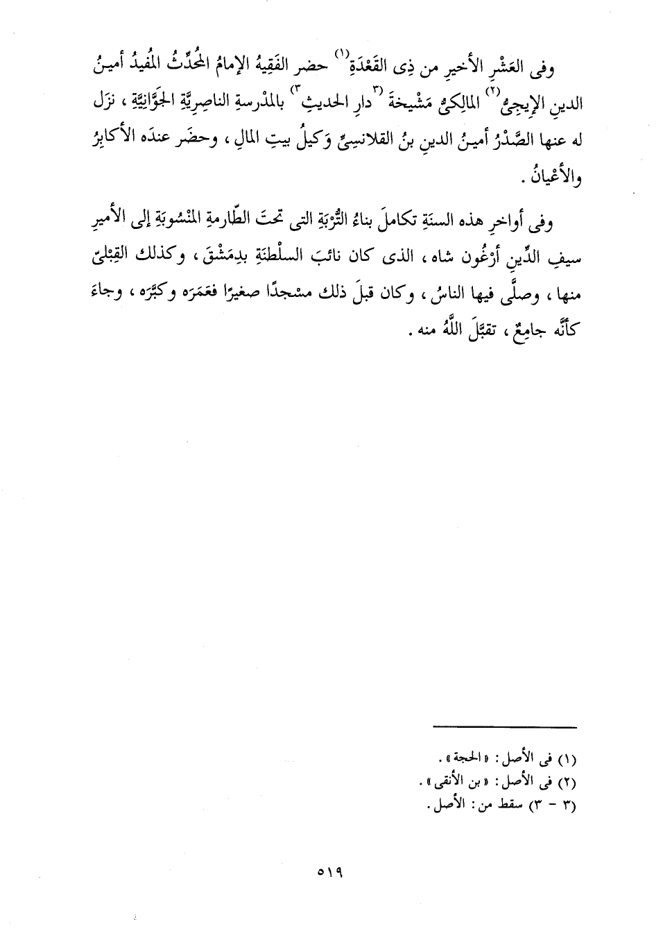 وَفِي الْعَشْرِ الْأَخِيرِ مِنْ ذِي الْقَعْدَةِ حَضَرَ الْفَقِيهُ الْإِمَامُ الْمُحَدِّثُ الْمُفِيدُ أَمِينُ الدِّينِ الْإِيجِيُّ الْمَالِكِيُّ مَشْيَخَةَ دَارِ الْحَدِيثِ بِالْمَدْرَسَةِ النَّاصِرِيَّةِ الْجَوَّانِيَّةِ، نَزَلَ لَهُ عَنْهَا الصَّدْرُ أَمِينُ الدِّينِ بْنُ الْقَلَانِسِيِّ وَكَيْلُ بَيْتِ الْمَالِ، وَحَضَرَ عِنْدَهُ الْأَكَابِرُ وَالْأَعْيَانُ.