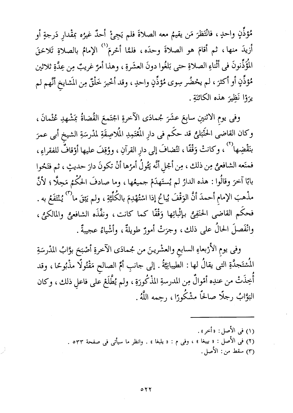 مُؤَذِّنٍ وَاحِدٍ، فَانْتَظَرَ مَنْ يُقِيمُ مَعَهُ الصَّلَاةَ فَلَمْ يَجِئْ أَحَدٌ غَيْرَهُ بِمِقْدَارِ دَرَجَةٍ أَوْ أَزْيَدَ مِنْهَا، ثُمَّ أَقَامَ هُوَ الصَّلَاةَ وَحْدَهُ، فَلَمَّا أَحْرَمَ الْإِمَامُ بِالصَّلَاةِ تَلَاحَقَ الْمُؤَذِّنُونَ فِي أَثْنَاءِ الصَّلَاةِ حَتَّى بَلَغُوا دُونَ الْعَشَرَةِ، وَهَذَا أَمْرٌ غَرِيبٌ مِنْ عِدَّةِ ثَلَاثِينَ مُؤَذِّنٍ أَوْ أَكْثَرَ، لَمْ يَحْضُرْ سِوَى مُؤَذِّنٍ وَاحِدٍ، وَقَدْ أَخْبَرَ خَلْقٌ مِنَ الْمَشَايِخِ أَنَّهُمْ لَمْ يَرَوْا نَظِيرَ هَذِهِ الْكَائِنَةِ.