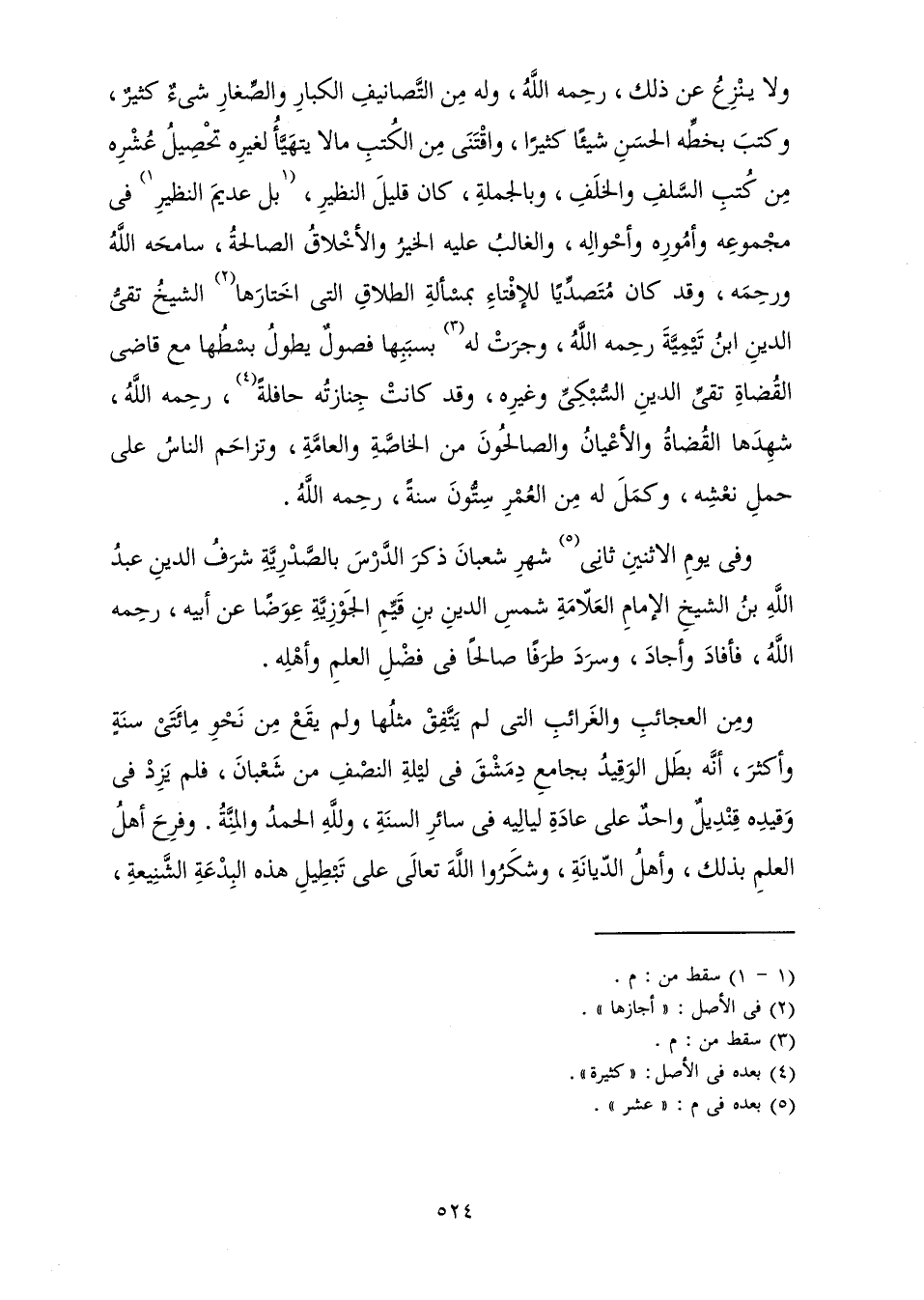 وَلَا يَنْزِعُ عَنْ ذَلِكَ، رَحِمَهُ اللَّهُ، وَلَهُ مِنَ التَّصَانِيفِ الْكِبَارِ وَالصِّغَارِ شَيْءٌ كَثِيرٌ، وَكَتَبَ بِخَطِّهِ الْحَسَنِ شَيْئًا كَثِيرًا، وَاقْتَنَى مِنَ الْكُتُبِ مَا لَا يَتَهَيَّأُ لِغَيْرِهِ تَحْصِيلُ عُشْرِهِ مِنْ كُتُبِ السَّلَفِ وَالْخَلَفِ، وَبِالْجُمْلَةِ كَانَ قَلِيلَ النَّظِيرِ، بَلْ عَدِيمَ النَّظِيرِ فِي مَجْمُوعِهِ، وَأُمُورِهِ، وَأَحْوَالِهِ، وَالْغَالِبُ عَلَيْهِ الْخَيْرُ وَالْأَخْلَاقُ الصَّالِحَةُ، سَامَحَهُ اللَّهُ وَرَحِمَهُ، وَقَدْ كَانَ مُتَصَدِّيًا لِلْإِفْتَاءِ بِمَسْأَلَةِ الطَّلَاقِ الَّتِي اخْتَارَهَا الشَّيْخُ تَقِيُّ الدِّينِ ابْنُ تَيْمِيَّةَ، وَجَرَتْ لَهُ بِسَبَبِهَا فُصُولٌ يَطُولُ بَسْطُهَا مَعَ قَاضِي الْقُضَاةِ تَقِيِّ الدِّينِ السُّبْكِيِّ وَغَيْرِهِ، وَقَدْ كَانَتْ جَنَازَتُهُ حَافِلَةً رَحِمَهُ اللَّهُ، شَهِدَهَا الْقُضَاةُ، وَالْأَعْيَانُ، وَالصَّالِحُونَ مِنَ الْخَاصَّةِ وَالْعَامَّةِ، وَتَزَاحَمَ النَّاسُ عَلَى حَمْلِ نَعْشِهِ، وَكَمَلَ لَهُ مِنَ الْعُمْرِ سِتُّونَ سَنَةً، رَحِمَهُ اللَّهُ.