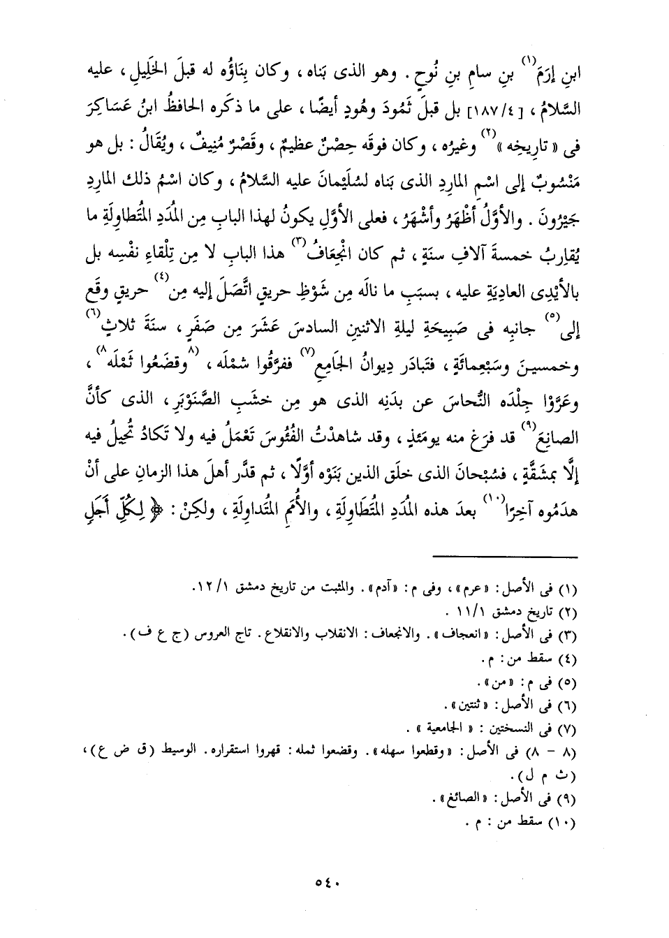 بْنِ إِرَمَ بْنِ سَامِ بْنِ نُوحٍ، وَهُوَ الَّذِي بَنَاهُ، وَكَانَ بِنَاؤُهُ لَهُ قَبْلَ الْخَلِيلِ عَلَيْهِ السَّلَامُ، بَلْ قَبْلَ ثَمُودَ وَهُودٍ أَيْضًا، عَلَى مَا ذَكَرَهُ الْحَافِظُ ابْنُ عَسَاكِرَ فِي " تَارِيخِهِ " وَغَيْرُهُ، وَكَانَ فَوْقَهُ حِصْنٌ عَظِيمٌ، وَقَصْرٌ مُنِيفٌ، وَيُقَالُ: بَلْ هُوَ مَنْسُوبٌ إِلَى اسْمِ الْمَارِدِ الَّذِي بَنَاهُ لِسُلَيْمَانَ عَلَيْهِ السَّلَامُ، وَكَانَ اسْمُ ذَلِكَ الْمَارِدِ جَيْرُونَ. وَالْأَوَّلُ أَظْهَرُ وَأَشْهَرُ، فَعَلَى الْأَوَّلِ يَكُونُ لِهَذَا الْبَابِ مِنَ الْمُدَدِ الْمُتَطَاوِلَةِ مَا يُقَارِبُ خَمْسَةَ آلَافِ سَنَةٍ، ثُمَّ كَانَ انْجِعَافُ هَذَا الْبَابِ لَا مِنْ تِلْقَاءِ نَفْسِهِ، بَلْ بِالْأَيْدِي الْعَادِيَةِ عَلَيْهِ; بِسَبَبِ مَا نَالَهُ مِنْ شَوْظِ حَرِيقٍ اتَّصَلَ إِلَيْهِ مِنْ حَرِيقٍ وَقَعَ إِلَى جَانِبِهِ فِي صَبِيحَةِ لَيْلَةِ الِاثْنَيْنِ السَّادِسَ عَشَرَ مِنْ صَفَرٍ، سَنَةَ ثَلَاثٍ وَخَمْسِينَ وَسَبْعِمِائَةٍ، فَتَبَادَرَ دِيوَانُ الْجَامِعِ فَفَرَّقُوا شَمْلَهُ، وَقَضَمُوا ثَمْلَهُ، وَعَرَّوْا جِلْدَهُ النُّحَاسَ عَنْ بَدَنِهِ الَّذِي هُوَ مِنْ خَشَبِ الصَّنَوْبَرِ الَّذِي كَأَنَّ الصَّانِعَ قَدْ فَرَغَ مِنْهُ يَوْمَئِذٍ، وَقَدْ شَاهَدْتُ الْفُئُوسَ تَعْمَلُ فِيهِ وَلَا تَكَادُ تُحِيلُ فِيهِ إِلَّا بِمَشَقَّةٍ، فَسُبْحَانَ الَّذِي خَلَقَ الَّذِينَ بَنَوْهُ أَوَّلًا، ثُمَّ قَدَّرَ أَهْلَ هَذَا الزَّمَانِ عَلَى أَنْ هَدَمُوهُ آخِرًا بَعْدَ هَذِهِ الْمُدَدِ الْمُتَطَاوِلَةِ، وَالْأُمَمِ الْمُتَدَاوَلَةِ، وَلَكِنْ: {لِكُلِّ أَجَلٍ كِتَابٌ} [الرعد: 38]