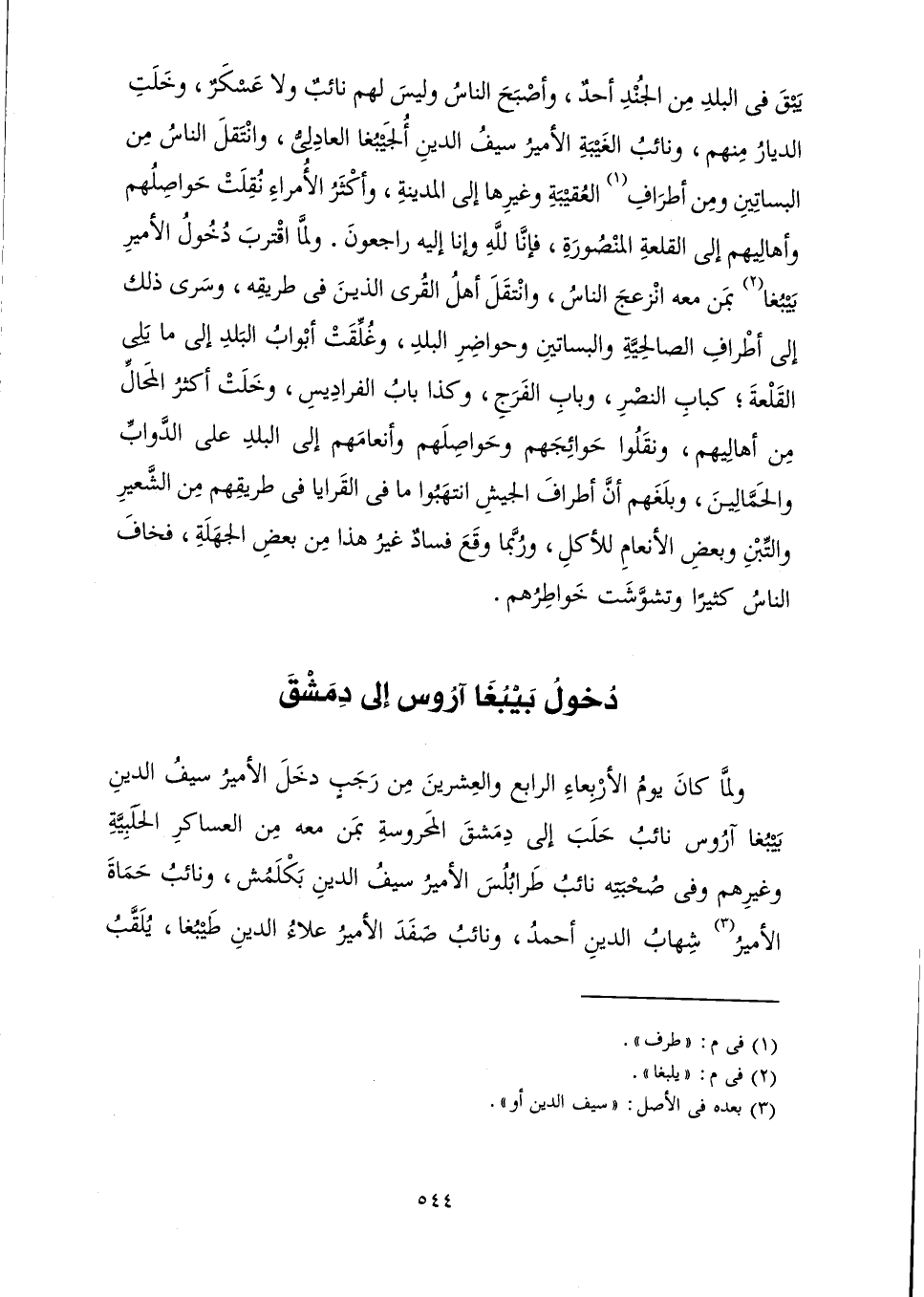 وَلَمَّا كَانَ يَوْمُ الْأَرْبِعَاءِ الرَّابِعِ وَالْعِشْرِينَ مِنْ رَجَبٍ دَخَلَ الْأَمِيرُ سَيْفُ الدِّينِ بَيْبُغَا آرُوسَ - نَائِبُ حَلَبَ - إِلَى دِمَشْقَ الْمَحْرُوسَةِ بِمَنْ مَعَهُ مِنَ الْعَسَاكِرِ الْحَلَبِيَّةِ، وَغَيْرِهِمْ، وَفِي صُحْبَتِهِ نَائِبُ طَرَابُلُسَ الْأَمِيرُ سَيْفُ الدِّينِ بَكْلَمُشْ، وَنَائِبُ حَمَاةَ الْأَمِيرُ شِهَابُ الدِّينِ أَحْمَدُ، وَنَائِبُ صَفَدَ الْأَمِيرُ عَلَاءُ الدِّينِ طَيْبُغَا - يُلَقَّبُ