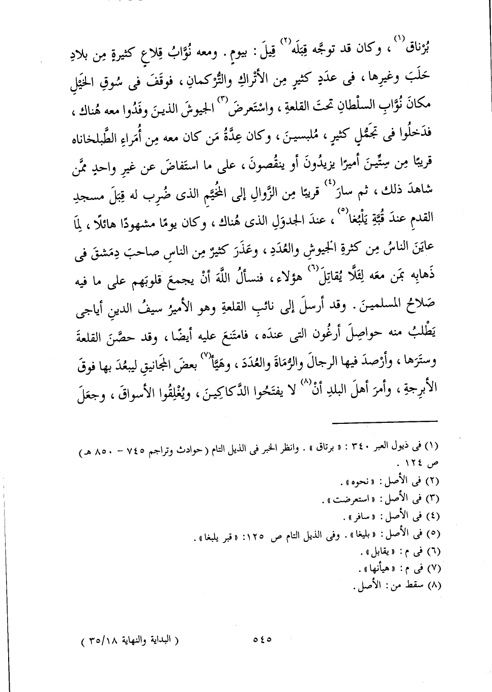 بُرْنَاقُ - وَكَانَ قَدْ تُوَجَّهُ قَبْلَهُ قِيلَ: بِيَوْمٍ. وَمَعَهُ نُوَّابُ قِلَاعٍ كَثِيرَةٍ مِنْ بِلَادِ حَلَبَ وَغَيْرِهَا، فِي عَدَدٍ كَثِيرٍ مِنَ الْأَتْرَاكِ وَالتُّرْكُمَانِ، فَوَقَفَ فِي سُوقِ الْخَيْلِ مَكَانَ نُوَّابِ السُّلْطَانِ تَحْتَ الْقَلْعَةِ، وَاسْتَعْرَضَ الْجُيُوشَ الَّذِينَ وَفَدُوا مَعَهُ هُنَاكَ، فَدَخَلُوا فِي تَجَمُّلٍ كَثِيرٍ مُلْبَسِينَ، وَكَانَ عِدَّةُ مَنْ كَانَ مَعَهُ مِنْ أُمَرَاءِ الطَّبْلَخَانَاهْ قَرِيبًا مِنْ سِتِّينَ أَمِيرًا، يَزِيدُونَ أَوْ يَنْقُصُونَ، عَلَى مَا اسْتَفَاضَ عَنْ غَيْرِ وَاحِدٍ مِمَّنْ شَاهَدَ ذَلِكَ، ثُمَّ سَارَ قَرِيبًا مِنَ الزَّوَالِ إِلَى الْمُخَيَّمِ الَّذِي ضُرِبَ لَهُ قَبْلَ مَسْجِدِ الْقَدْمِ عِنْدَ قُبَّةِ بَيْبُغَا عِنْدَ الْجَدْوَلِ الَّذِي هُنَاكَ، وَكَانَ يَوْمًا مَشْهُودًا هَائِلًا; لِمَا عَايَنَ النَّاسُ مِنْ كَثْرَةِ الْجُيُوشِ وَالْعُدَدِ، وَعَذَرَ كَثِيرٌ مِنَ النَّاسِ صَاحِبَ دِمَشْقَ فِي ذَهَابِهِ بِمَنْ مَعَهُ لِئَلَّا يُقَاتِلَ هَؤُلَاءِ، فَنَسْأَلُ اللَّهَ أَنْ يَجْمَعَ قُلُوبَهُمْ عَلَى مَا فِيهِ صَلَاحُ الْمُسْلِمِينَ. وَقَدْ أَرْسَلَ إِلَى نَائِبِ الْقَلْعَةِ، وَهُوَ الْأَمِيرُ سَيْفُ الدِّينِ أَيَاجِي - يَطْلُبُ مِنْهُ حَوَاصِلَ أَرْغُونَ الَّتِي عِنْدَهُ، فَامْتَنَعَ عَلَيْهِ أَيْضًا، وَقَدْ حَصَّنَ الْقَلْعَةَ، وَسَتَرَهَا، وَأَرْصَدَ فِيهَا الرِّجَالَ، وَالرُّمَاةَ، وَالْعُدَدَ، وَهَيَّأَ بَعْضَ الْمَجَانِيقِ لِيَبْعُدَ بِهَا فَوْقَ الْأَبْرِجَةِ، وَأَمَرَ أَهْلَ الْبَلَدِ أَنْ لَا يَفْتَحُوا الدَّكَاكِينَ، وَيُغْلِقُوا الْأَسْوَاقَ، وَجَعَلَ