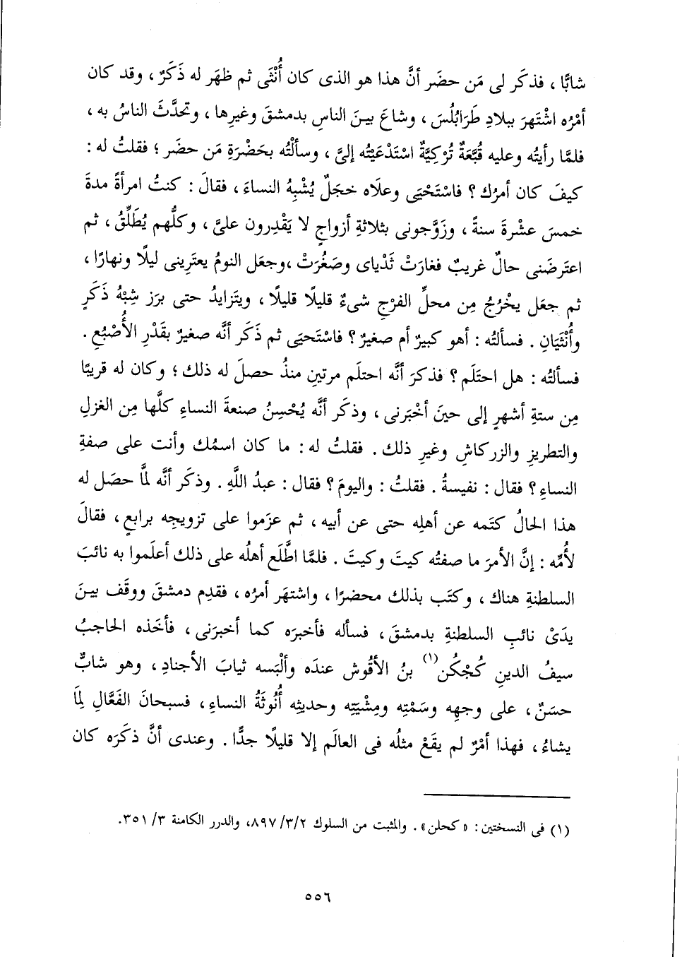 شَابًّا، فَذَكَرَ لِي مَنْ حَضَرَ أَنَّ هَذَا هُوَ الَّذِي كَانَ أُنْثَى ثُمَّ ظَهَرَ لَهُ ذَكَرٌ، وَقَدْ كَانَ أَمْرُهُ اشْتَهَرَ بِبِلَادِ طَرَابُلُسَ، وَشَاعَ بَيْنَ النَّاسِ بِدِمَشْقَ وَغَيْرِهَا، وَتَحَدَّثَ النَّاسُ بِهِ، فَلَمَّا رَأَيْتُهُ وَعَلَيْهِ قُبَّعَةٌ تُرْكِيَّةٌ اسْتَدْعَيْتُهُ إِلَيَّ، وَسَأَلْتُهُ بِحَضْرَةِ مَنْ حَضَرَ، فَقُلْتُ لَهُ: كَيْفَ كَانَ أَمْرُكَ؟ فَاسْتَحْيَى وَعَلَاهُ خَجَلٌ يُشْبِهُ النِّسَاءَ، فَقَالَ: كُنْتُ امْرَأَةً مُدَّةَ خَمْسَ عَشْرَةَ سَنَةً، وَزَوَّجُونِي بِثَلَاثَةِ أَزْوَاجٍ لَا يَقْدِرُونَ عَلَيَّ، وَكُلُّهُمْ يُطَلِّقُ، ثُمَّ اعْتَرَضَنِي حَالٌ غَرِيبٌ، فَغَارَتْ ثَدْيَايَ وَصَغُرَتْ، وَجَعَلَ النَّوْمُ يَعْتَرِينِي لَيْلًا وَنَهَارًا، ثُمَّ جَعَلَ يَخْرُجُ مِنْ مَحَلِّ الْفَرْجِ شَيْءٌ قَلِيلًا قَلِيلًا، وَيَتَزَايَدُ حَتَّى بَرَزَ شِبْهُ ذَكَرٍ وَأُنْثَيَانِ. فَسَأَلَتْهُ: أَهْوَ كَبِيرٌ أَمْ صَغِيرٌ؟ فَاسْتَحْيَى ثُمَّ ذَكَرَ أَنَّهُ صَغِيرٌ بِقَدْرِ الْأُصْبُعِ. فَسَأَلَتْهُ: هَلِ احْتَلَمَ؟ فَذَكَرَ أَنَّهُ احْتَلَمَ مَرَّتَيْنِ مُنْذُ حَصَلَ لَهُ ذَلِكَ. وَكَانَ لَهُ قَرِيبًا مِنْ سِتَّةِ أَشْهُرٍ إِلَى حِينِ أَخْبَرَنِي، وَذَكَرَ أَنَّهُ يُحْسِنُ صَنْعَةَ النِّسَاءِ كُلَّهَا مِنَ الْغَزَلِ، وَالتَّطْرِيزِ، وَالزَّرْكَاشِ، وَغَيْرِ ذَلِكَ، فَقُلْتُ لَهُ: مَا كَانَ اسْمُكَ وَأَنْتَ عَلَى صِفَةِ النِّسَاءِ؟ فَقَالَ: نَفِيسَةُ. فَقُلْتُ: وَالْيَوْمَ؟ فَقَالَ: عَبْدُ اللَّهِ. وَذَكَرَ أَنَّهُ لَمَّا حَصَلَ لَهُ هَذَا الْحَالُ كَتَمَهُ عَنْ أَهْلِهِ حَتَّى عَنْ أَبِيهِ، ثُمَّ عَزَمُوا عَلَى تَزْوِيجِهِ بِرَابِعٍ، فَقَالَ لِأُمِّهِ: إِنَّ الْأَمْرَ مَا صَفَّتْهُ كَيْتَ وَكَيْتَ، فَلَمَّا اطَّلَعَ أَهْلُهُ عَلَى ذَلِكَ أَعْلَمُوا بِهِ نَائِبَ السَّلْطَنَةِ هُنَاكَ، وَكُتِبَ بِذَلِكَ مَحْضَرًا، وَاشْتَهَرَ أَمْرُهُ، فَقَدِمَ دِمَشْقَ، وَوَقَفَ بَيْنَ يَدَيْ نَائِبِ السَّلْطَنَةِ بِدِمَشْقَ، فَسَأَلَهُ فَأَخْبَرَهُ كَمَا أَخْبَرَنِي، فَأَخَذَهُ الْحَاجِبُ سَيْفُ الدِّينِ كُجْكُنُ بْنُ الْأَقْوَشِ عِنْدَهُ، وَأَلْبَسَهُ ثِيَابَ الْأَجْنَادِ، وَهُوَ شَابٌّ حَسَنٌ، عَلَى وَجْهِهِ وَسِمَتِهِ وَمِشْيَتِهِ وَحَدِيثِهِ أُنُوثَةُ النِّسَاءِ، فَسُبْحَانَ الْفَعَّالِ لِمَا يَشَاءُ، فَهَذَا أَمُرٌ لَمْ يَقَعْ مِثْلُهُ فِي الْعَالَمِ إِلَّا قَلِيلًا جِدًّا. وَعِنْدِي أَنَّ ذَكَرَهُ كَانَ