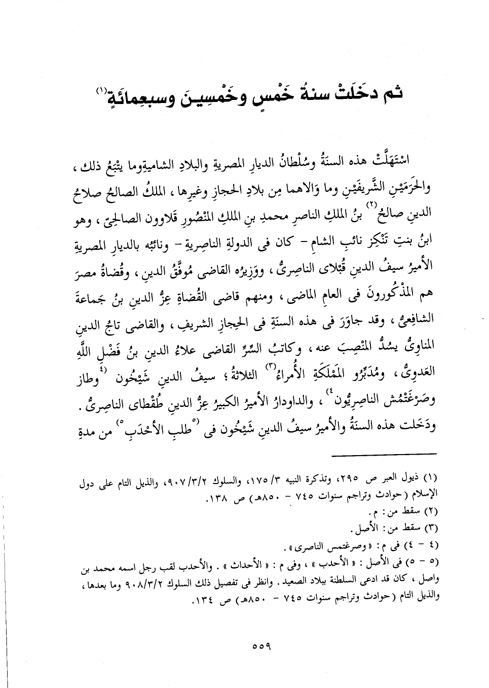 اسْتَهَلَّتْ هَذِهِ السُّنَةُ وَسُلْطَانُ الدِّيَارِ الْمِصْرِيَّةِ، وَالْبِلَادِ الشَّامِيَّةِ، وَمَا يَتْبَعُ ذَلِكَ، وَالْحَرَمَيْنِ الشَّرِيفَيْنِ، وَمَا وَالَاهُمَا مِنْ بِلَادِ الْحِجَازِ وَغَيْرِهَا - الْمَلِكُ الصَّالِحُ صَلَاحُ الدِّينِ ابْنُ الْمَلِكِ النَّاصِرِ مُحَمَّدٍ ابْنِ الْمَلِكِ الْمَنْصُورِ قَلَاوُونَ الصَّالِحِيُّ، وَهُوَ ابْنُ بِنْتِ تَنْكِزَ نَائِبِ الشَّامِ - وَكَانَ فِي الدَّوْلَةِ النَّاصِرِيَّةِ - وَنَائِبُهُ بِالدِّيَارِ الْمِصْرِيَّةِ الْأَمِيرُ سَيْفُ الدِّينِ قُبْلَايْ النَّاصِرِيُّ، وَوَزِيرُهُ الْقَاضِي مُوَفَّقُ الدِّينِ، وَقُضَاةُ مِصْرَ هُمُ الْمَذْكُورُونَ فِي الْعَامِ الْمَاضِي، وَمِنْهُمْ قَاضِي الْقُضَاةِ عِزُّ الدِّينِ بْنُ جَمَاعَةَ الشَّافِعِيُّ، وَقَدْ جَاوَرَ فِي هَذِهِ السَّنَةِ فِي الْحِجَازِ الشَّرِيفِ، وَالْقَاضِي تَاجُ الدِّينِ الْمَنَاوِيُّ يَسُدُّ الْمَنْصِبَ عَنْهُ، وَكَاتِبُ السِّرِّ الْقَاضِي عَلَاءُ الدِّينِ بْنُ فَضْلِ اللَّهِ الْعَدَوِيُّ، وَمُدَبِّرُوا الْمَمْلَكَةِ الْأُمَرَاءُ الثَّلَاثَةُ; سَيْفُ الدِّينِ شَيْخُونُ، وَطَازْ، وَصَرْغَتْمُشُ النَّاصِرِيُّونَ، وَالدَّوَادَارُ الْأَمِيرُ الْكَبِيرُ عِزُّ الدِّينِ طُقْطَايْ النَّاصِرِيُّ.